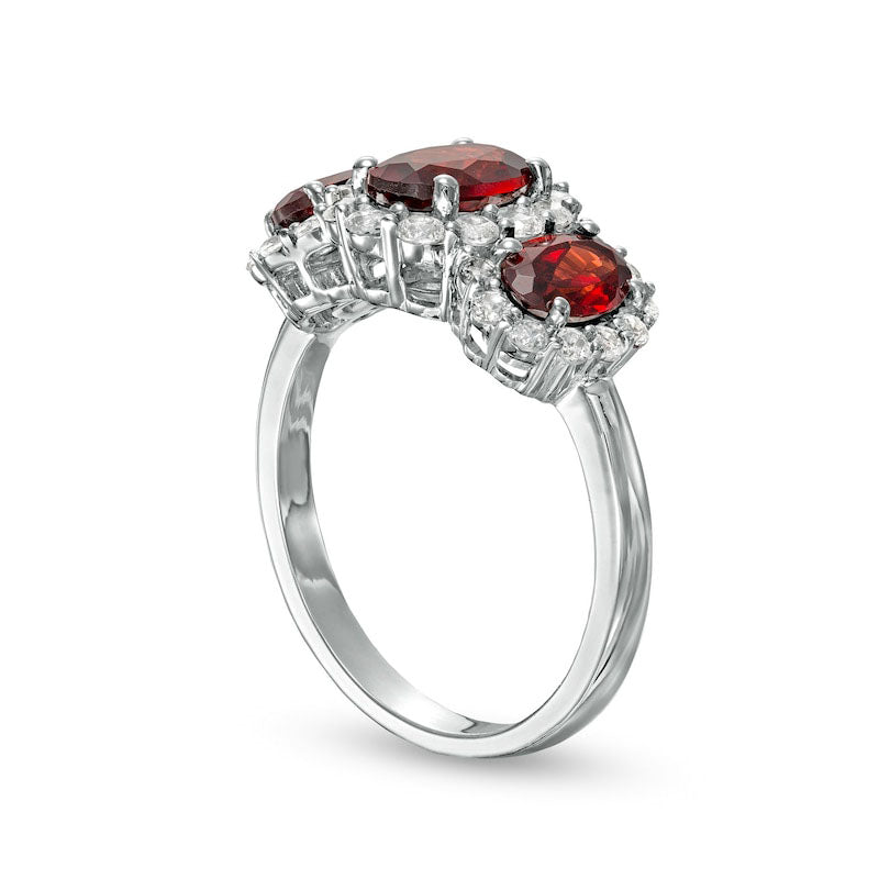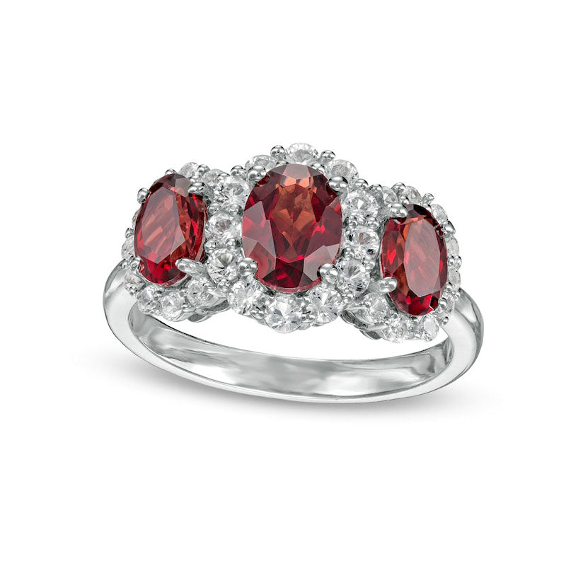 Oval Garnet and White Lab-Created Sapphire Frame Three Stone Ring in Sterling Silver