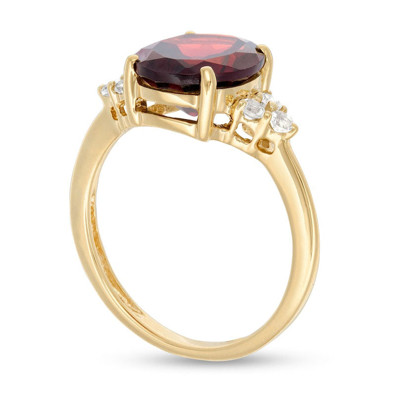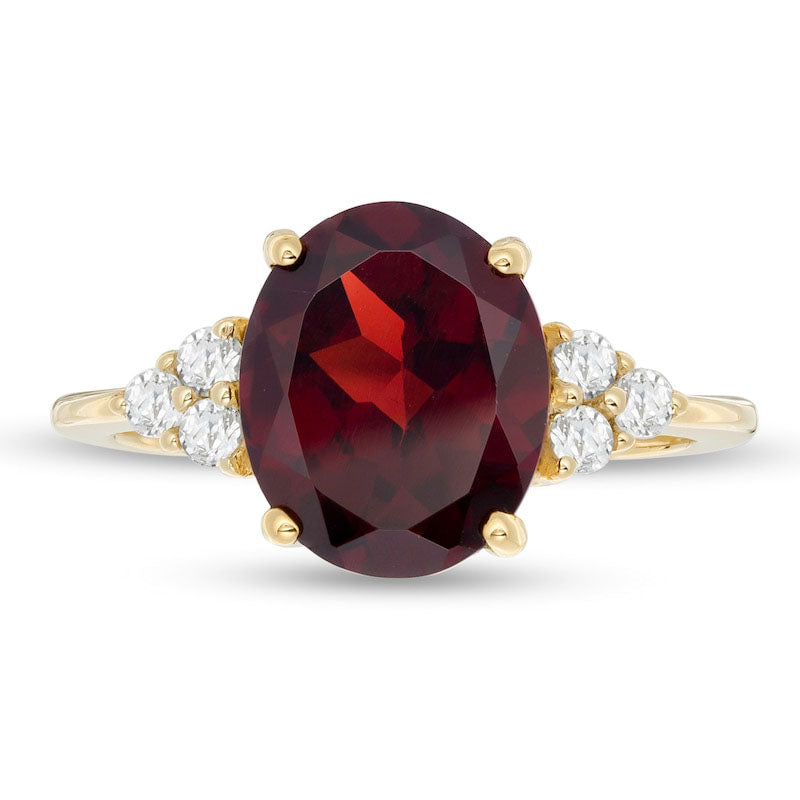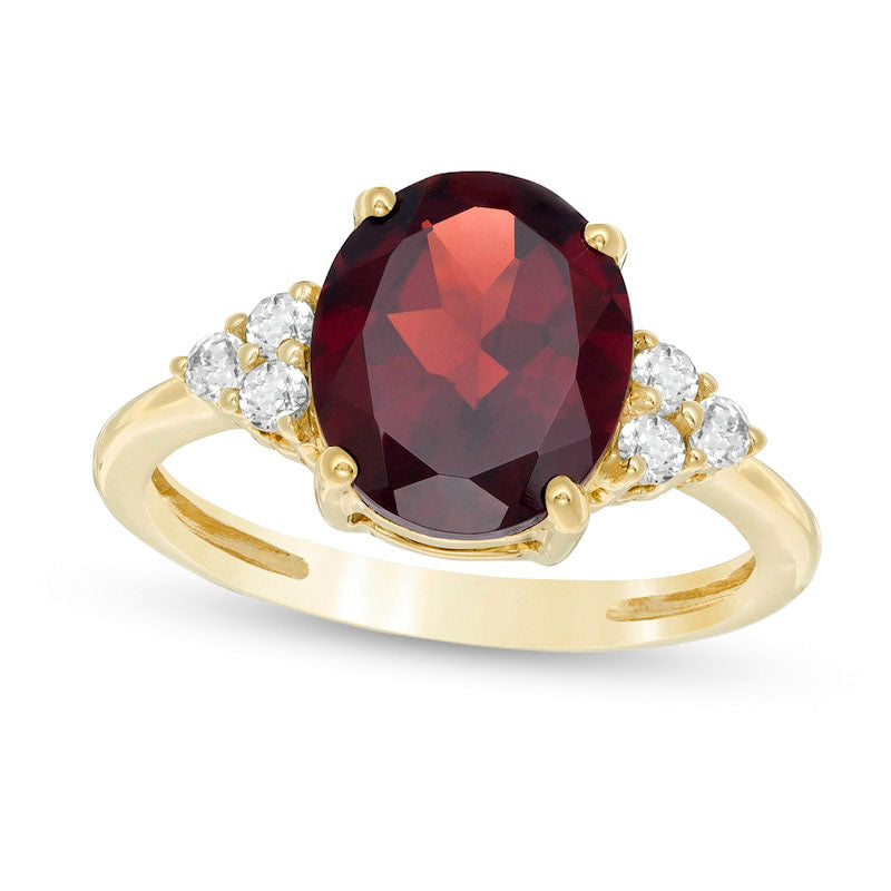 Enhance your loved one's jewelry collection with this stunning gemstone ring. Carefully crafted in radiant 10K gold, this magnificent piece showcases a regal oval-shaped garnet measuring 11.0 x 9.0mm, surrounded by trios of sparkling white topaz. Its exquisite design makes it a perfect choice for any occasion. With its polished finish, this ring glistens beautifully to add extra elegance to any outfit. Give the gift of luxury with this captivating ring that is sure to steal her heart.