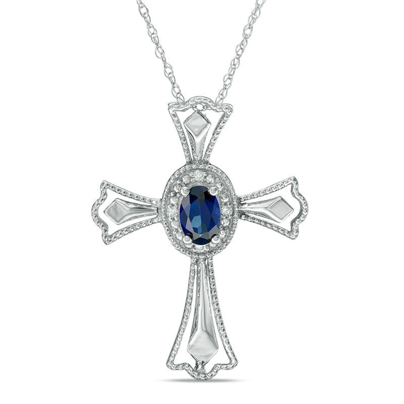 Oval Lab-Created Blue Sapphire and Diamond Accent Gothic-Style Cross Pendant in 10K White Gold