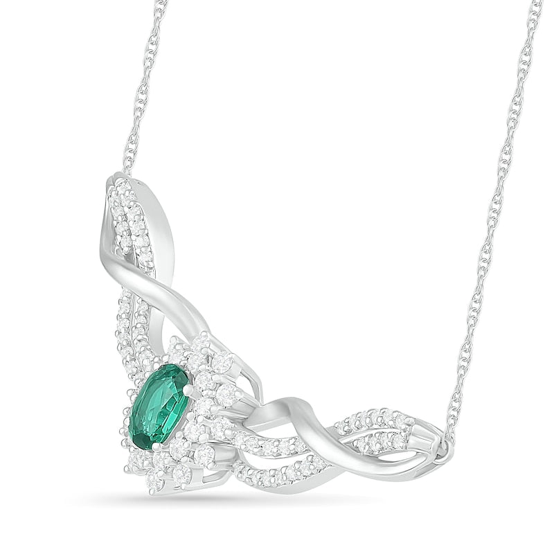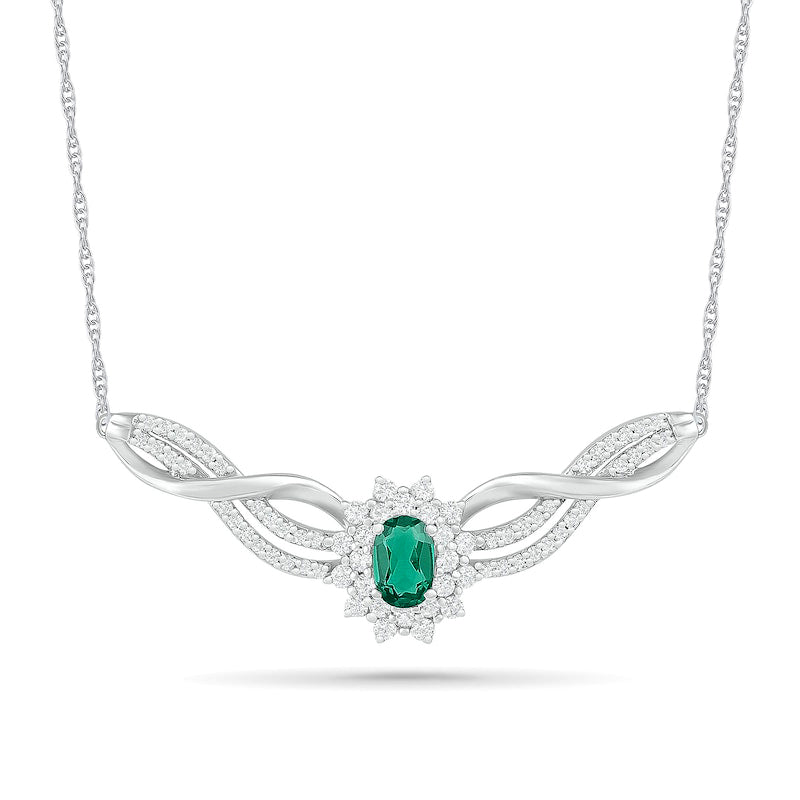 Oval Lab-Created Emerald and White Sapphire Starburst Frame Triple Row Twist Ribbon Necklace in Sterling Silver