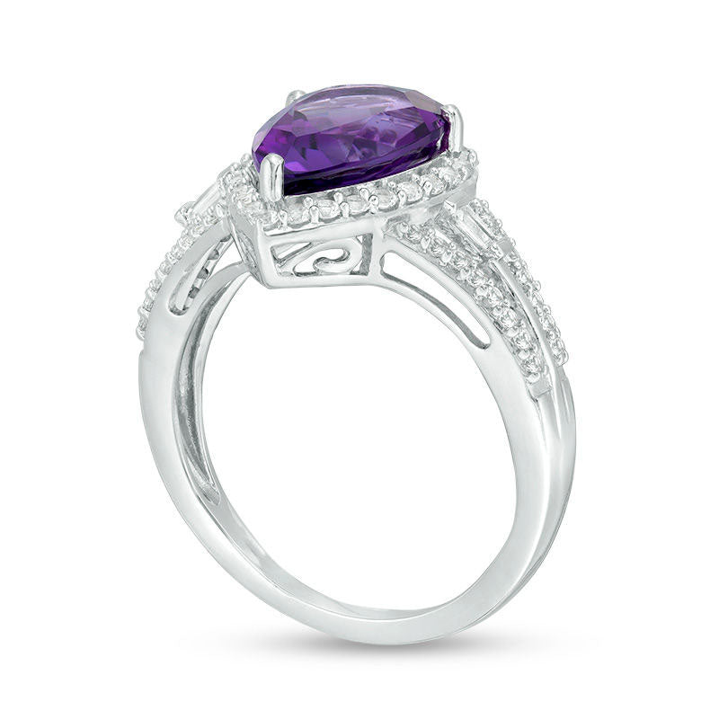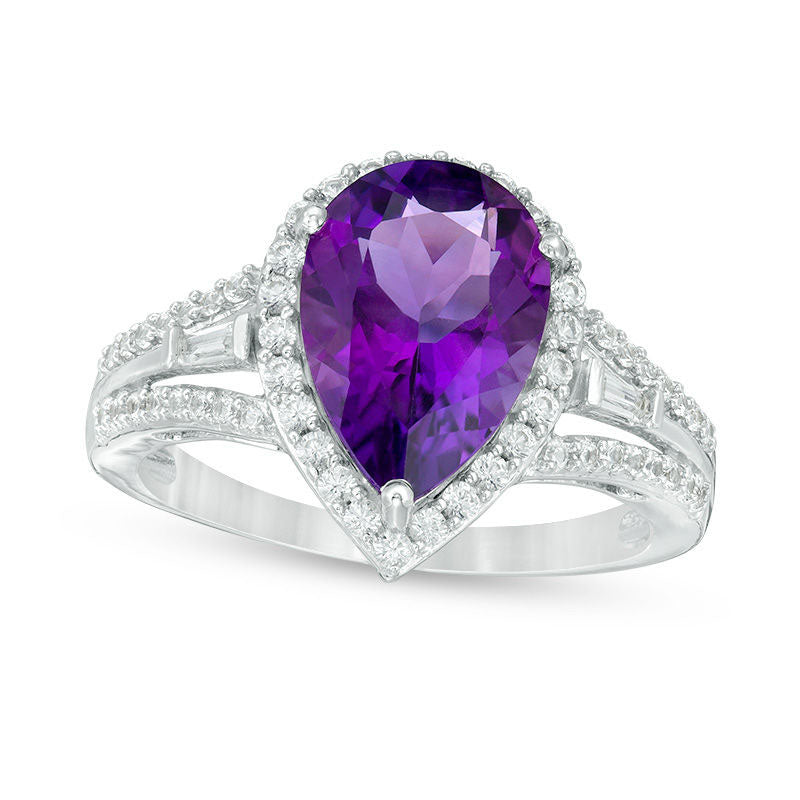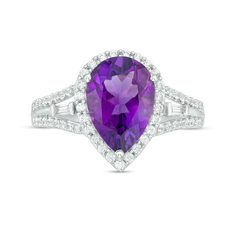 Pear-Shaped Amethyst and Lab-Created White Sapphire Frame Triple Row Split Shank Ring in Sterling Silver