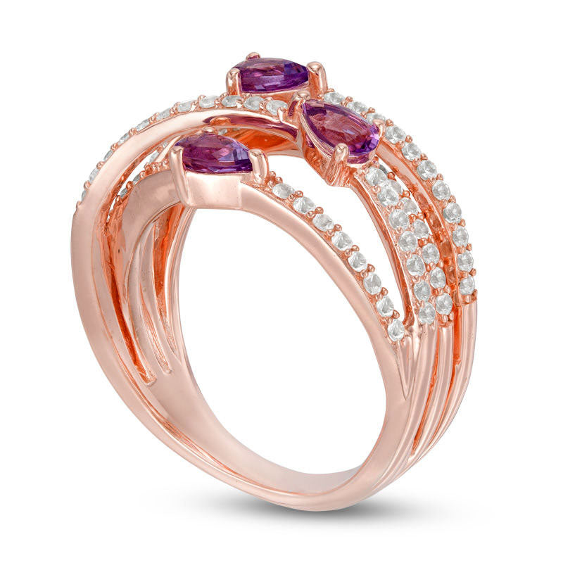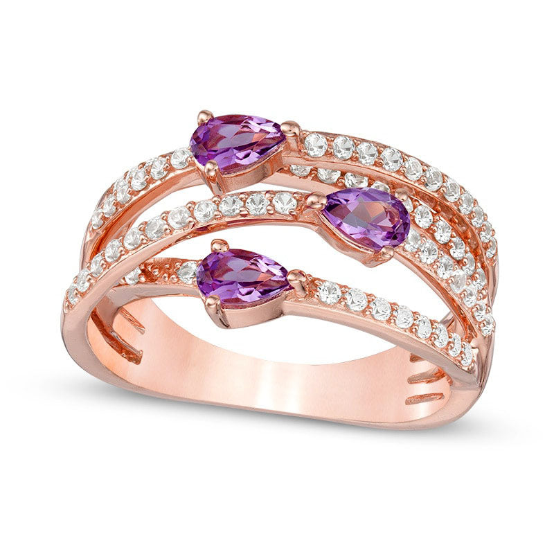 Pear-Shaped Amethyst and Lab-Created White Sapphire Three Stone Orbit Ring in Sterling Silver and Solid 14K Rose Gold Plate