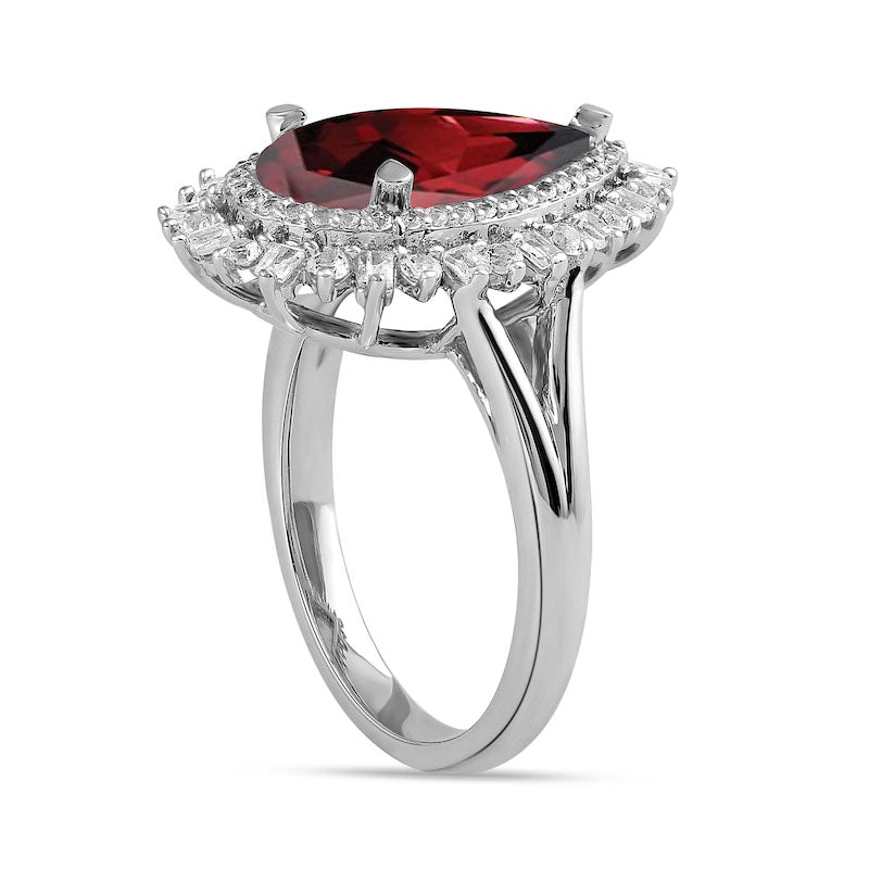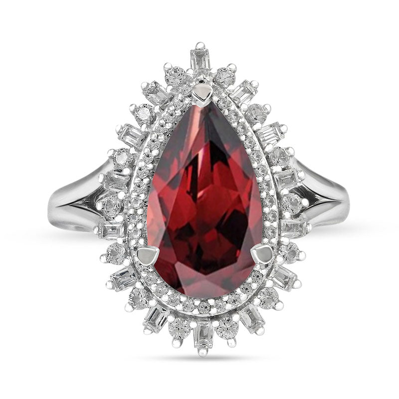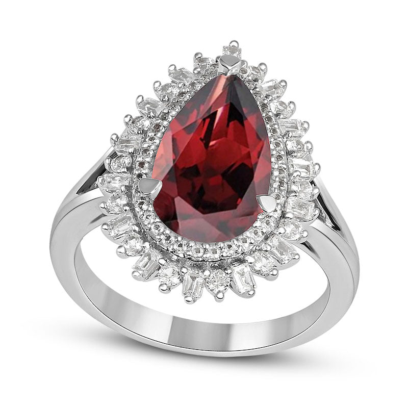 Pear-Shaped Garnet and White Lab-Created Sapphire Double Shadow Frame Split Shank Ring in Sterling Silver