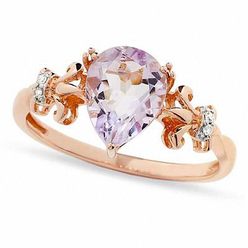 Pear-Shaped Rose de France Amethyst and Natural Diamond Accent Ring in Solid 10K Rose Gold