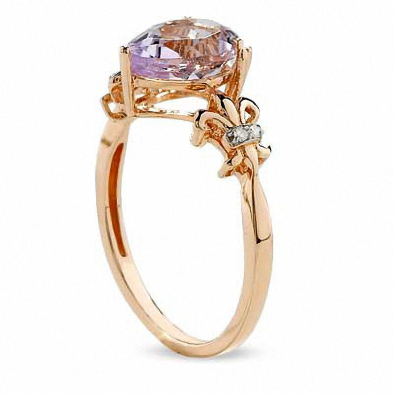 Indulge in the luxurious beauty of pink with our Pear-Shaped Rose de France Amethyst and Diamond Accent Ring crafted in 10K Rose Gold. Its breathtaking centerpiece features a 9.0 x...