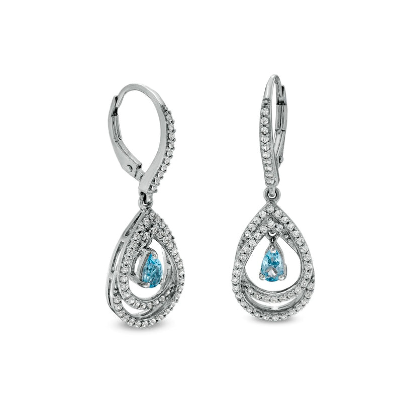 Pear-Shaped Swiss Blue Topaz and White Lab-Created Sapphire Double Loop Open Frame Teardrop Earrings in Sterling Silver