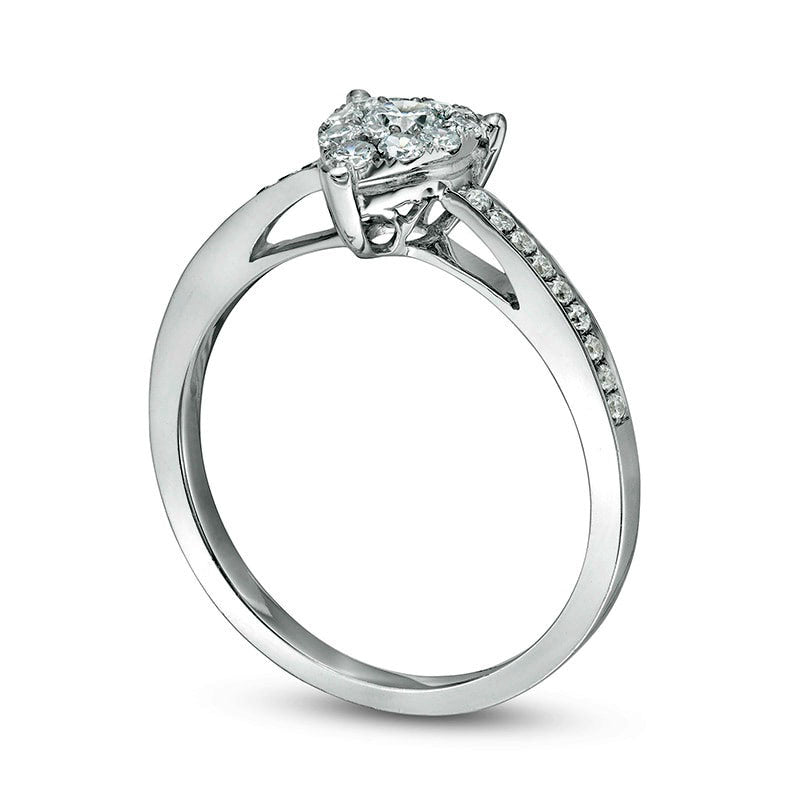 This stunning diamond engagement ring is the ultimate symbol of love. Made of 14K white gold, it features a dazzling 1/8 ct. diamond encased in a teardrop-shaped frame embellished with a variety of different-sized diamonds. The band is also adorned with diamonds, completing this captivating design. Boasting a total of 3/8 ct. t.w. of diamonds and a lustrous polish, this engagement ring is an unforgettable expression of true love. Please note that as this is pre-owned jewellery, the ring you receive may have previously been sized and cannot be resized at purchase. We are unable to guarantee the size of any pre-owned ring due to the constantly changing nature of our inventory.