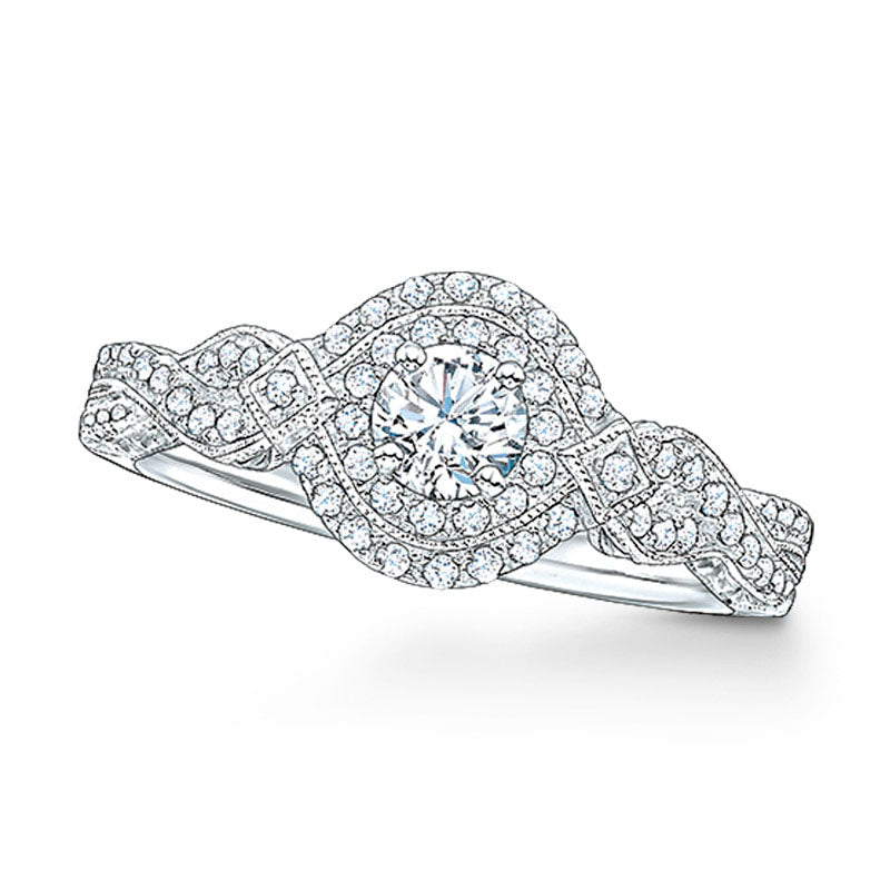 This previously owned engagement ring is a stunning vintage-style piece that will surely impress your beloved. With 5/8 CT. T.W. of diamonds, this 14K white gold ring features a 1/3 ct. round diamond center stone surrounded by a halo frame of smaller accent diamonds. The swirling shank is also adorned with diamond-lined ribbons and intricate milgrain detailing, giving the ring a romantic, heirloom look. Please note that due to the nature of pre-owned jewelry, the ring may have been previously sized and cannot be resized at purchase. Nonetheless, this ring will add a touch of elegance and sparkle to any proposal with its polished shine and captivating design.