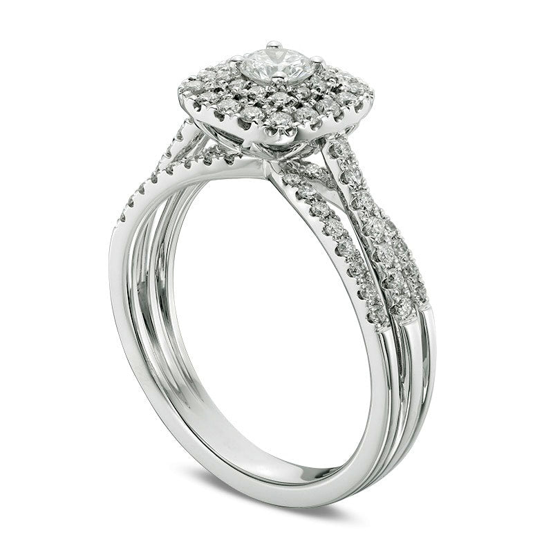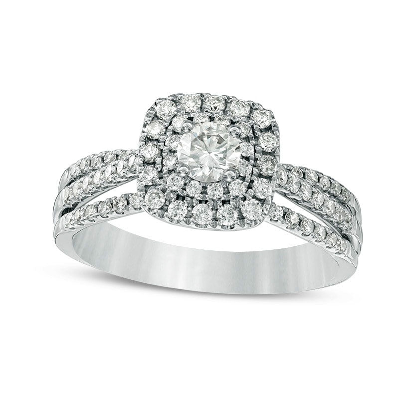 Previously Owned - 0.75 CT. T.W. Natural Diamond Double Cushion Frame Multi-Row Split Shank Engagement Ring in Solid 14K White Gold