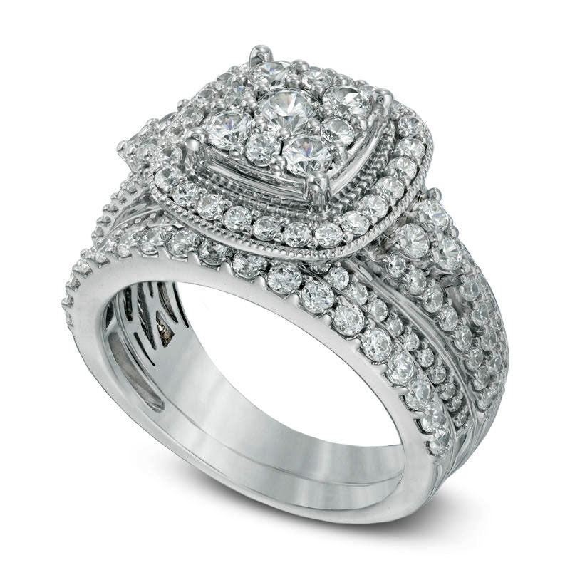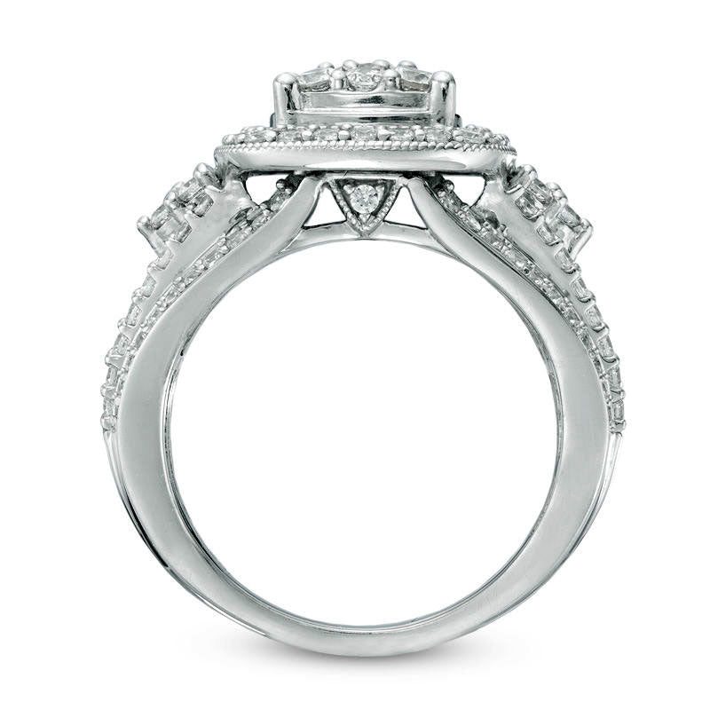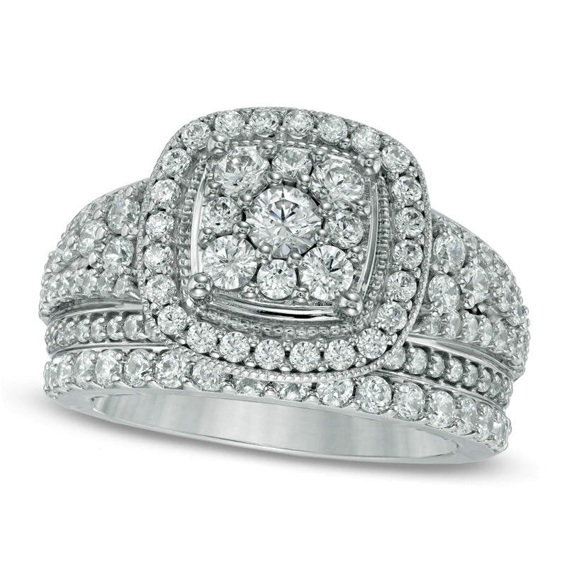 Previously Owned - 1.75 CT. T.W. Natural Diamond Frame Cluster Bridal Engagement Ring Set in Solid 14K White Gold