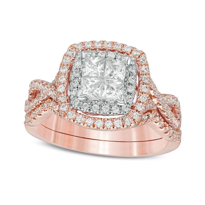 Previously Owned - 1.0 CT. T.W. Quad Princess-Cut Natural Diamond Double Frame Twist Bridal Engagement Ring Set in Solid 14K Two-Tone Gold