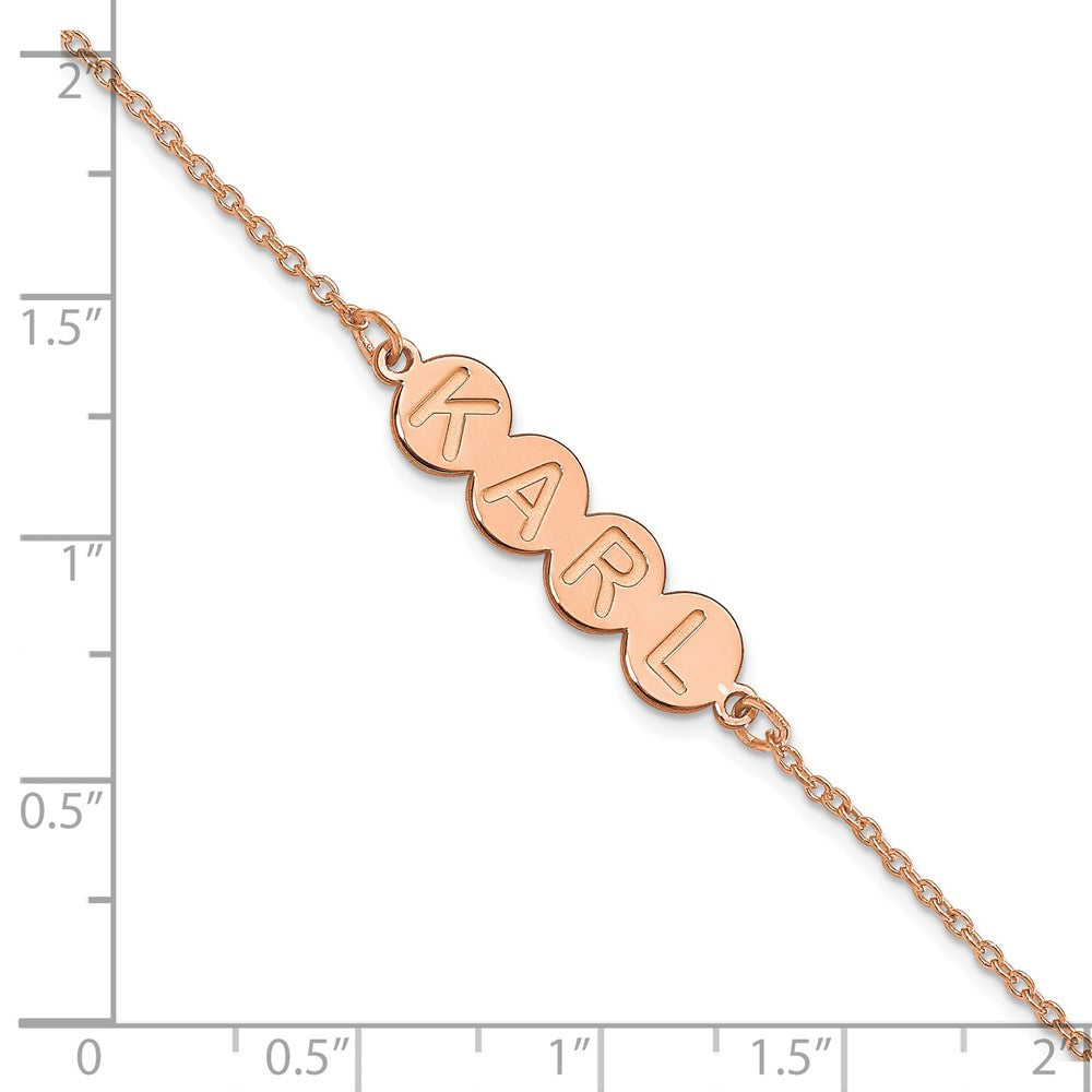 Introducing the Rose Plated Sterling Silver 4 Letter Bubble Bracelet, a perfect piece for everyday wear. Crafted from high-quality sterling silver with a beautiful rose-tone plating, this bracelet adds a touch of charm to any outfit. Its smooth, polished finish and comfortable lobster clasp ensure a secure fit. The bracelet features a fun, customizable design with space for four initials, making it unique to you. At 27.63 mm wide and weighing just enough for comfy wear, the Rose Plated Sterling Silver 4 Letter Bubble Bracelet is an eye-catching accessory. Celebrate your style with this personalized piece.
