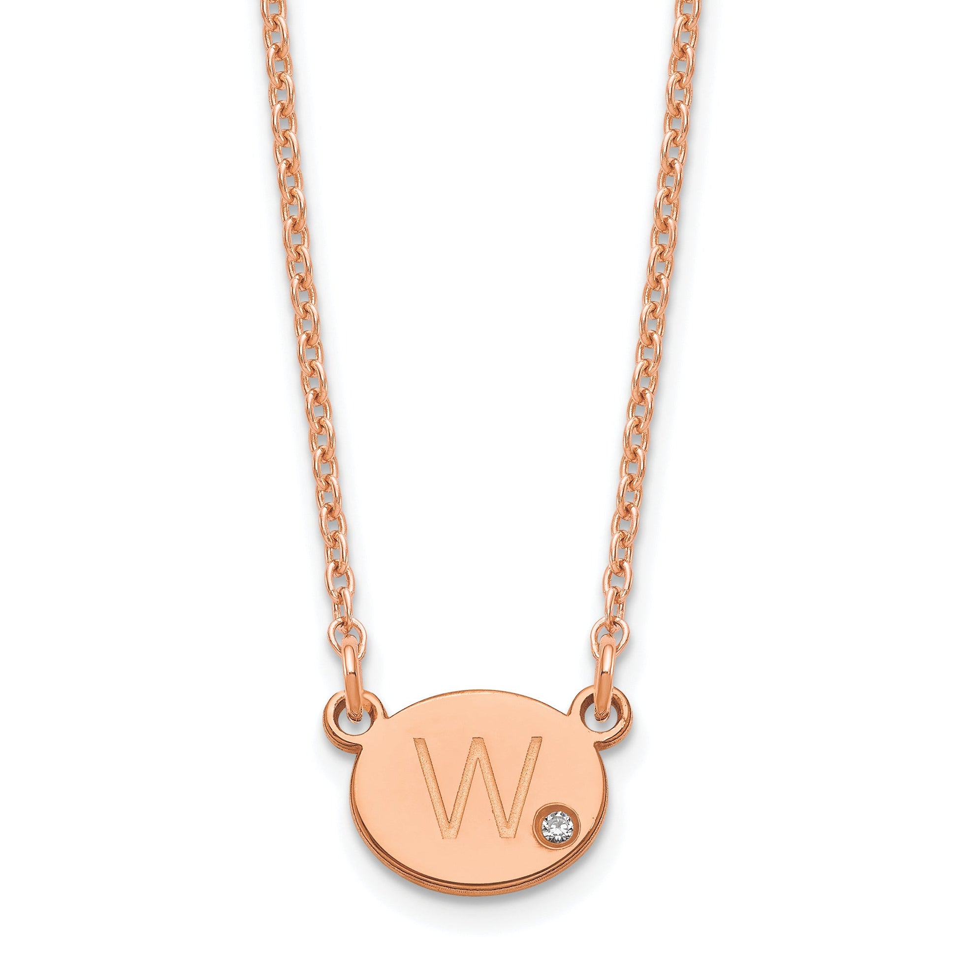 Discover the stunning Ss/Rose Plated Sterling Silver/Rose-Plated Oval Initial With Diamond Necklace, a perfect piece for any woman who loves personal style. This necklace features a beautiful 925 sterling silver base with a soft rose plating that adds charm. The oval initial charm, measuring nearly 8 mm by 12 mm, is accented with a sparkling white diamond, giving it a touch of elegance. The 18-inch cable chain enhances the charm without overwhelming it. This personalized jewelry piece combines timeless design with a modern twist, making it a great gift or treat for yourself. The name "Initial With Diamond Necklace" truly captures its unique appeal.