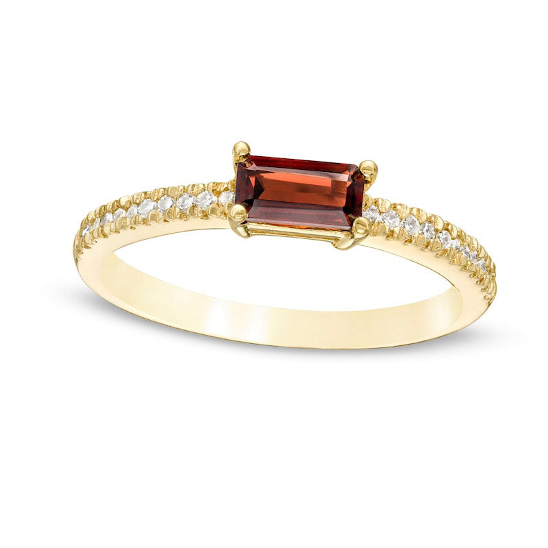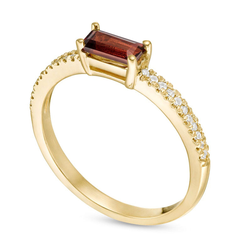 This stunning 10K gold ring is the perfect addition to any jewelry collection. Featuring a striking 6.0 x 3.0mm baguette-cut garnet in a sideways setting, this piece is sure to capture attention. The shank is adorned with shimmering diamonds, totaling 1/10 ct. t.w. The result is a truly captivating design with a brilliant luster that will leave a lasting impression. Whether worn alone or stacked with other rings, this gemstone and diamond ring is an elegant and sophisticated choice for any occasion.