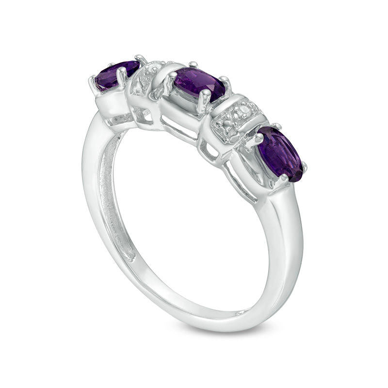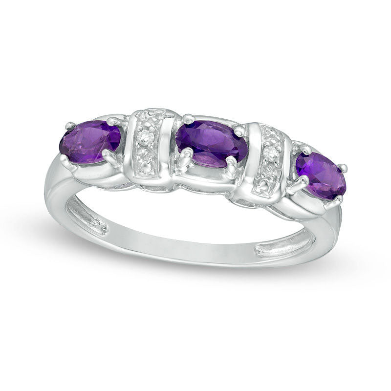 Sideways Oval Amethyst and Natural Diamond Accent Three Stone Station Ring in Sterling Silver