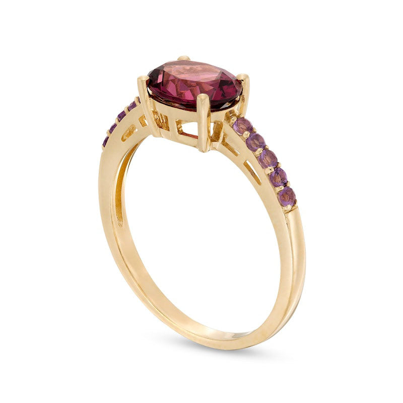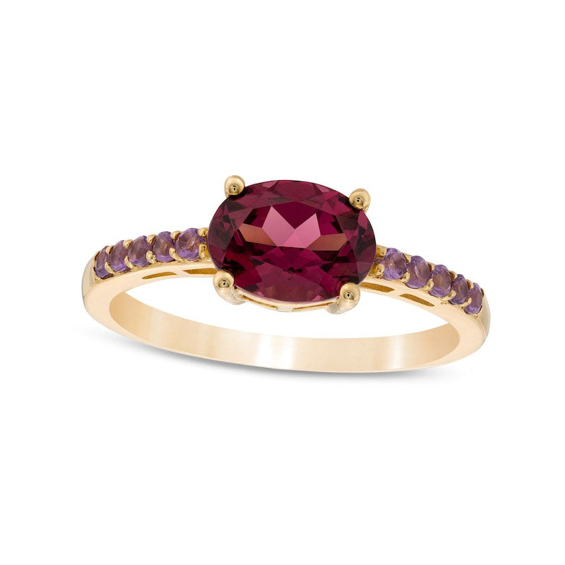 Sideways Oval Rhodolite and Amethyst Ring in Solid 10K Yellow Gold