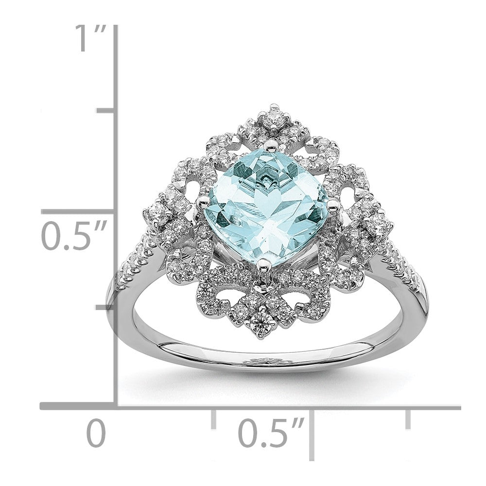 This complete engagement ring features a stunning simulated aquamarine center stone surrounded by a vintage-style CZ halo. Crafted from polished 14k white gold, it includes four additional CZ stones accenting the main stone and 20 and 48 CZ stones lining the band. Rhodium plating adds a lustrous finish to the band, which measures 1.4 mm wide. The center stone is a cushion-cut aquamarine measuring 7 mm and weighing 1.75 ct, while the accent CZ stones are round, with sizes of 1.4 mm, 1 mm, and 0.8 mm, respectively. The head of the ring measures 7.9 mm tall. This engagement ring may be resized as needed and is perfect for any occasion.