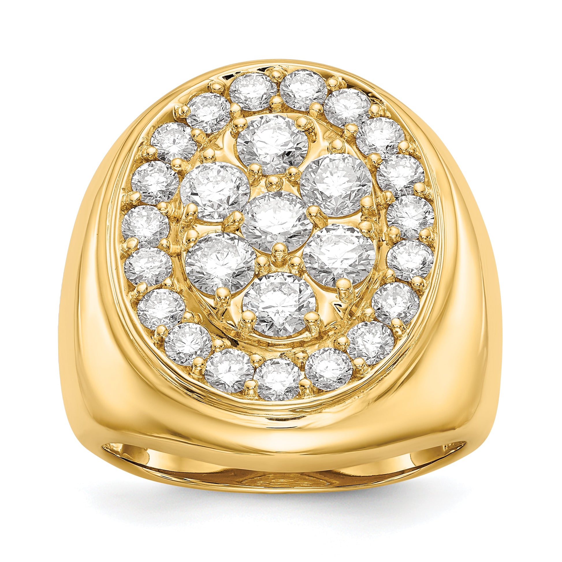 This men's ring is made of solid 14k yellow gold and features a simulated CZ stone. The ring is polished to a smooth finish and the two CZ stones are both white in color. The ring has a total of 26 stones, with 19 smaller ones and 7 larger ones. The stones are prong-set and the ring is complete with all stones included. The stones are all round in shape, with the smaller stones measuring 2.6mm and the larger ones measuring 3.9mm. The item weighs in grams and is sold individually as a men's ring. The ring has a faceted stone cut and the stones are naturally created. The side stones are mounted and the birthstone months for both stones are April. The stone color grade is G-I and the clarity is I2 (A).