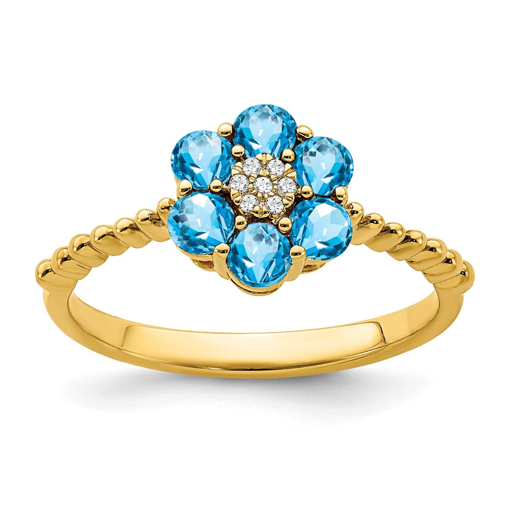 Solid 14k Yellow Gold Simulated Blue Topaz and CZ Floral Ring