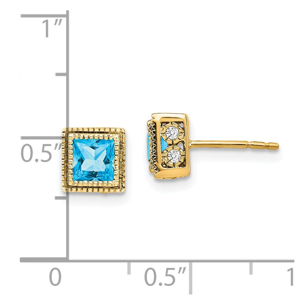 Solid 14k Yellow Gold Square Simulated Blue Topaz and CZ Earrings