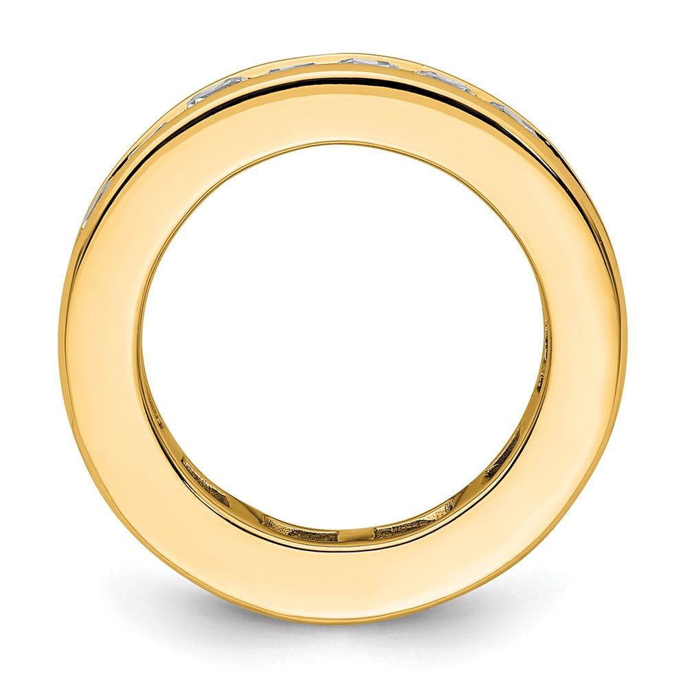 This ring is complete with all stones included and is not sizeable. It features 18 square-shaped, 0.14 ct cubic zirconia and three 0.16 ct cubic zirconia. The ring is finished with a sleek and polished look and plated with rhodium to ensure long-lasting shine. It is suitable for eternity, and it is sold individually. The ring's primary color is yellow, and the stone creation method for both stones used is synthetic.