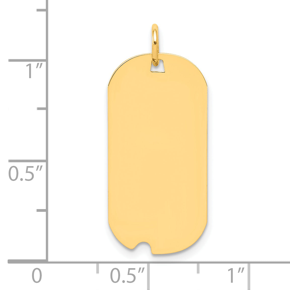 The Gold Plated Sterling Silver Engravable Dog Tag Polished Disc Charm adds a touch of elegance to any collection. Made from pure 925 sterling silver, this charm boasts a polished gold-plated finish that shines brilliantly. It's a versatile piece, measuring 31 mm in length and 13 mm in width, while the charm itself is 26 mm long, making it perfect for everyday wear. The charm's flat back profile and solid design ensure durability, while its notched edges give it a unique twist. Enjoy personalizing it with custom engravings for a meaningful touch. Add the Gold Plated Sterling Silver Engravable Dog Tag Polished Disc Charm to your jewelry box and make a style statement.