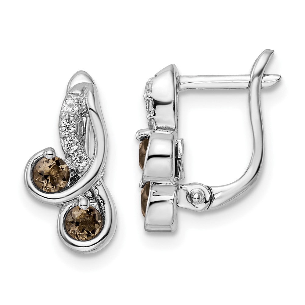 These stunning hinged earrings are made with high-quality sterling silver and plated with rhodium for extra shine and durability. Featuring a swirl design encrusted with 4 round smoky quartz stones and 8 round white topaz stones, a total weight of 0.52 carats, these unique earrings will add sophistication and elegance to any outfit. The earrings measure 13.9mm in length and feature a post, notch and lock closure for secure wear. These earrings are perfect for women who love statement jewelry and make a great gift for any special occasion.