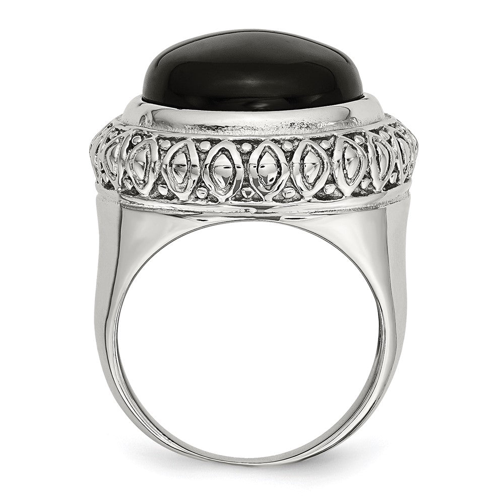 Elevate your style with the Stainless Steel Black Glass W/Textured Edge Ring. Crafted from durable stainless steel, this ring features a sleek black glass stone that adds a bold touch to any outfit. Its textured edge gives it a modern vibe, making it perfect for women who love standout accessories. The polished finish enhances its shine, while the standard fit ensures comfort for daily wear. The Stainless Steel Black Glass W/Textured Edge Ring is an eye-catching addition to any jewelry collection, combining strength and style in one striking piece.