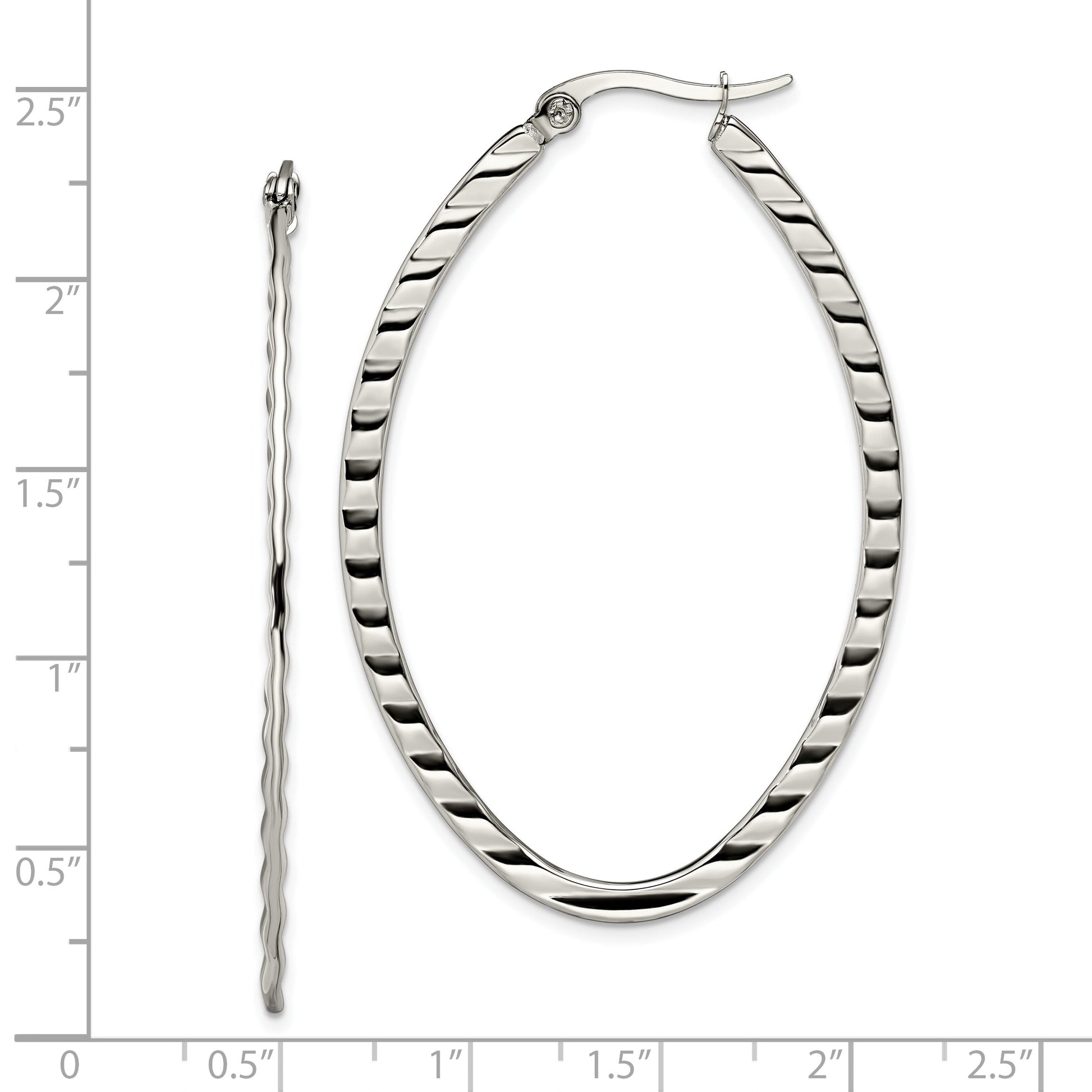 Get ready to flaunt your style with our Stainless Steel Chisel Polished and Textured Oval Hoop Earrings. These earrings offer a sleek, polished finish with an intriguing textured design. The 52mm length and 37.5mm width create a bold statement, while the 2mm thickness ensures durability and comfort. Crafted from stainless steel with a classy white hue, they securely close with a wire and clutch, perfect for any occasion. Packaged in an elegant gift pouch, these oval hoops make an exceptional gift or a treat for yourself. Elevate your look with these graceful Stainless Steel Chisel Oval Hoop Earrings.
