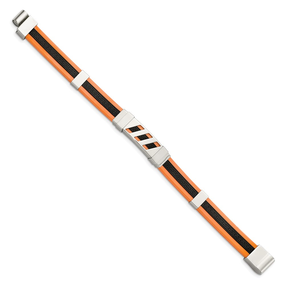 The Stainless Steel Chisel Polished Black and Orange Rubber Bracelet is a striking accessory for the modern man. Crafted with a polished finish, this 8-inch bracelet showcases an intricate Greek key design. Its bold black and orange color scheme adds a pop of style to any outfit. Made from durable stainless steel and rubber, it features a secure magnetic clasp, ensuring it stays in place throughout the day. Enjoy both comfort and fashion with its 10mm width. This stylish men's bracelet arrives in an elegant gift box, ready to impress.