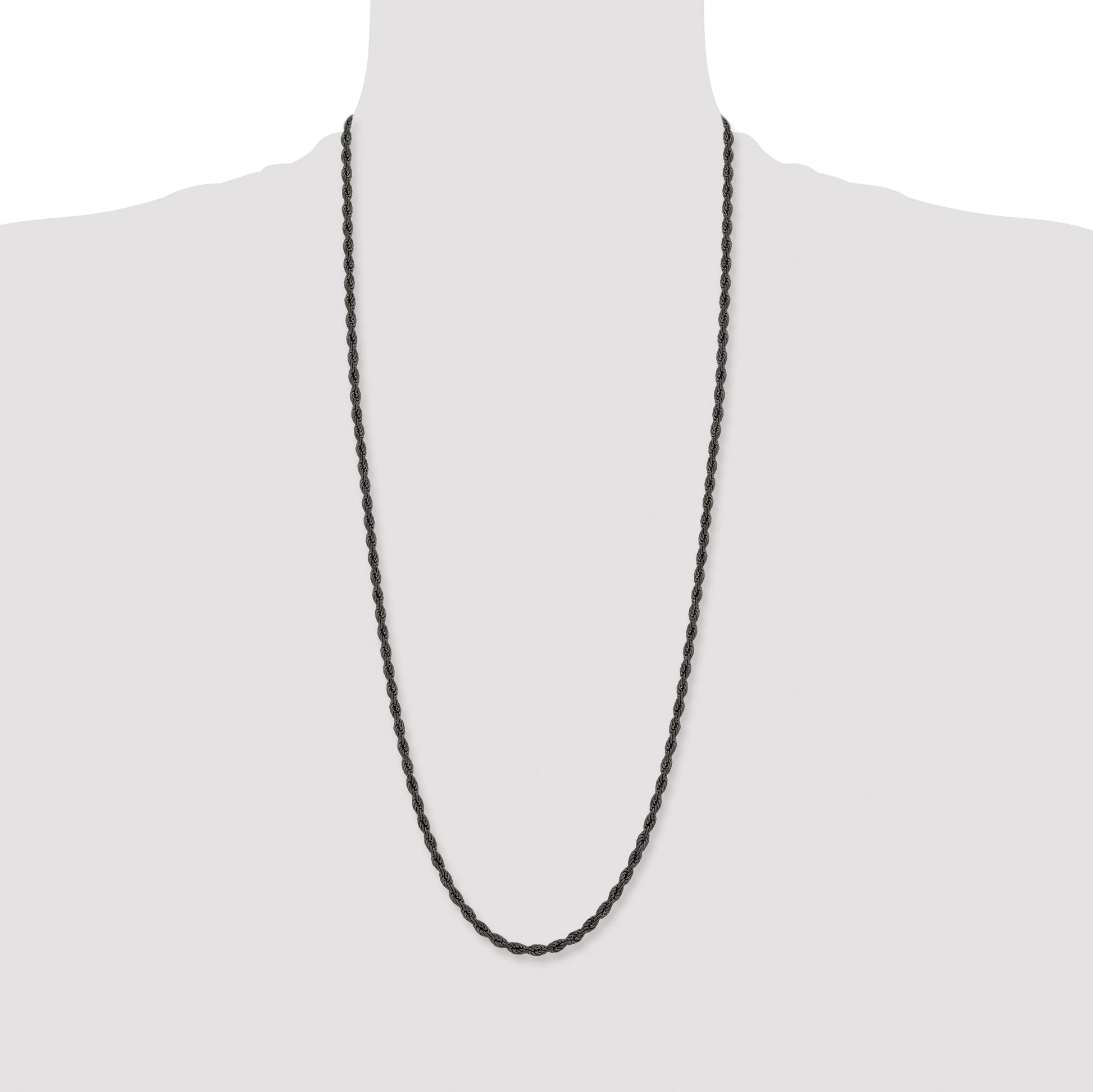 The Stainless Steel Chisel Polished Black IP-Plated 4mm 30 Inch Rope Chain is a true statement piece. This 30-inch long necklace features a stylish rope design, crafted from durable stainless steel. The chain's 4mm width gives it a solid feel without being too heavy. A polished finish enhances its look, adding a sleek touch. Black IP-plating gives the chain a bold and edgy vibe. The sturdy lobster clasp ensures a secure fit, making it perfect for everyday wear. Packaged in a classy gift pouch, this chain is an excellent choice for anyone. The Stainless Steel Chisel Polished Black IP-Plated Rope Chain embodies elegance and strength.