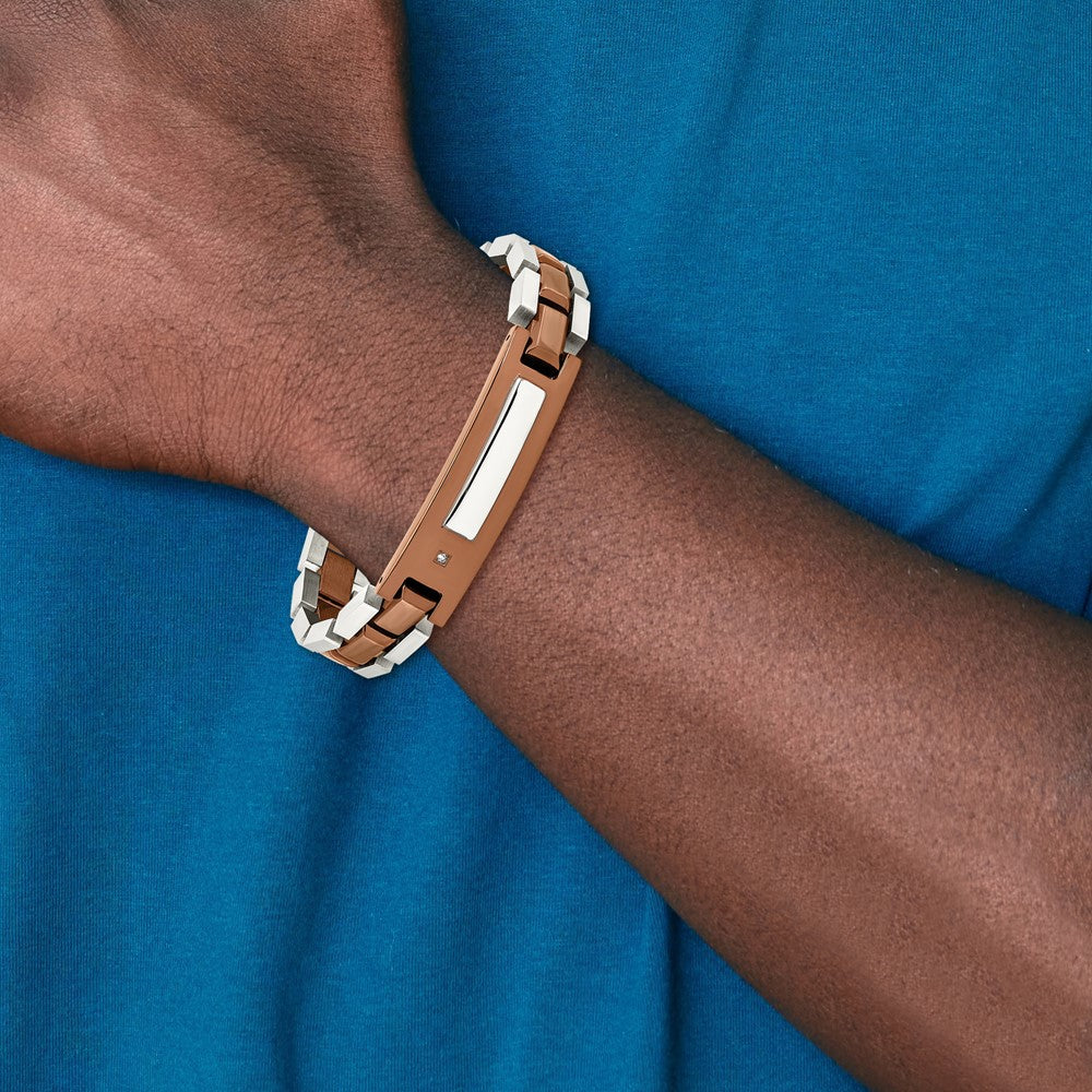 The Stainless Steel Chisel Polished Brown IP-Plated Bracelet is a refined piece that captures elegance and strength. Crafted with stainless steel, this men's bracelet boasts an 8.5-inch length, making it the ideal fit for most wrists. It features a dazzling 0.01 carat natural diamond embedded in its chiseled design, adding a touch of luxury to any outfit. The rich brown IP plating adds warmth and distinction, while the robust link chain and fold-over clasp ensure durability and security. Presented neatly in a gift box, this bracelet makes a standout accessory for any occasion.
