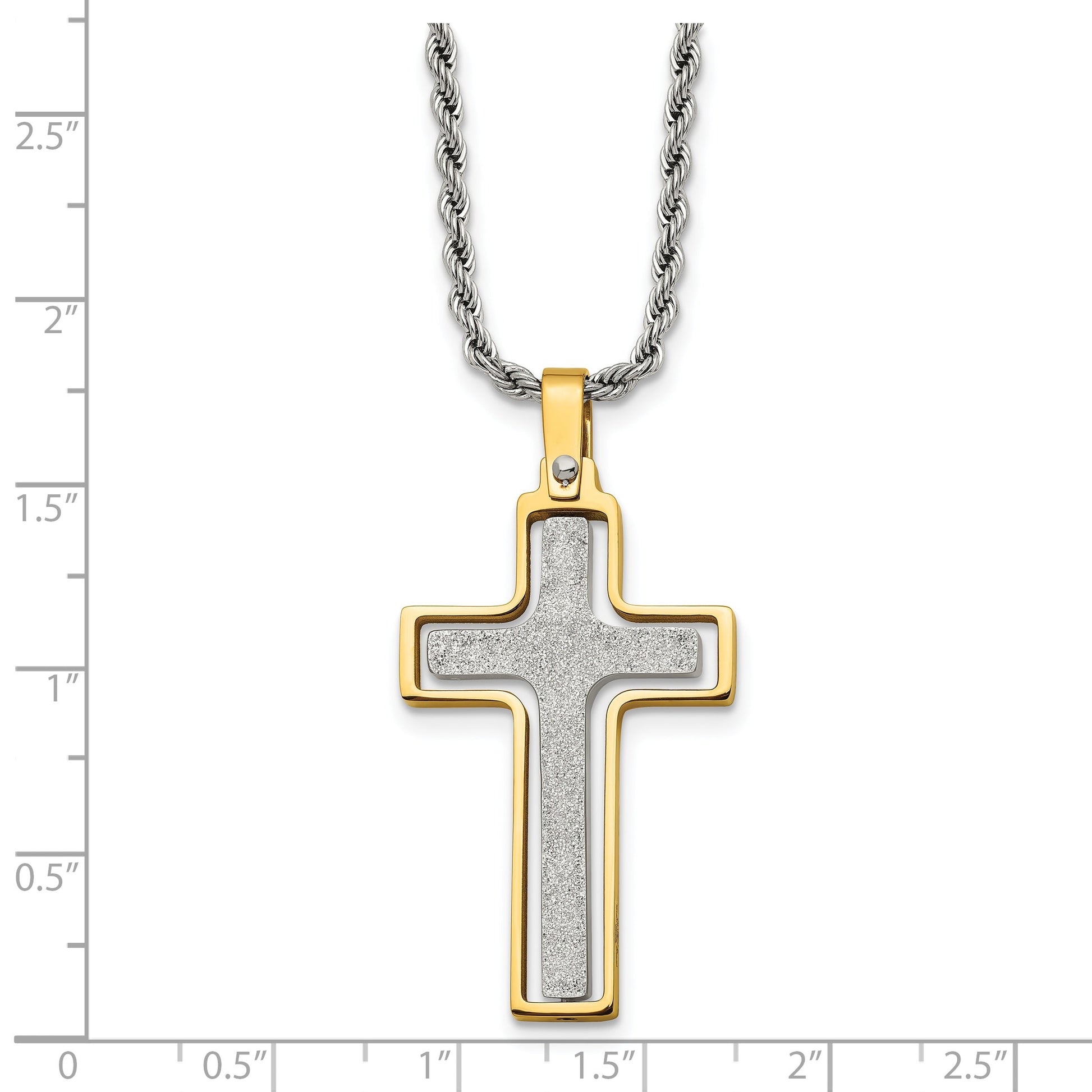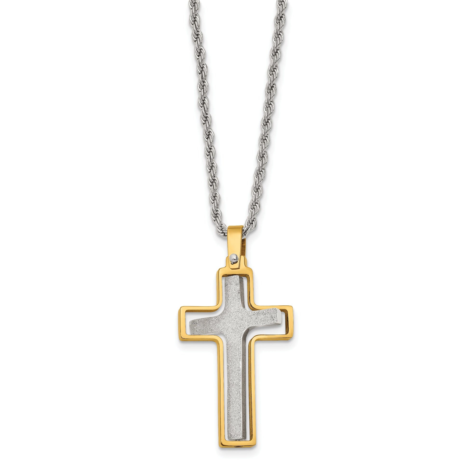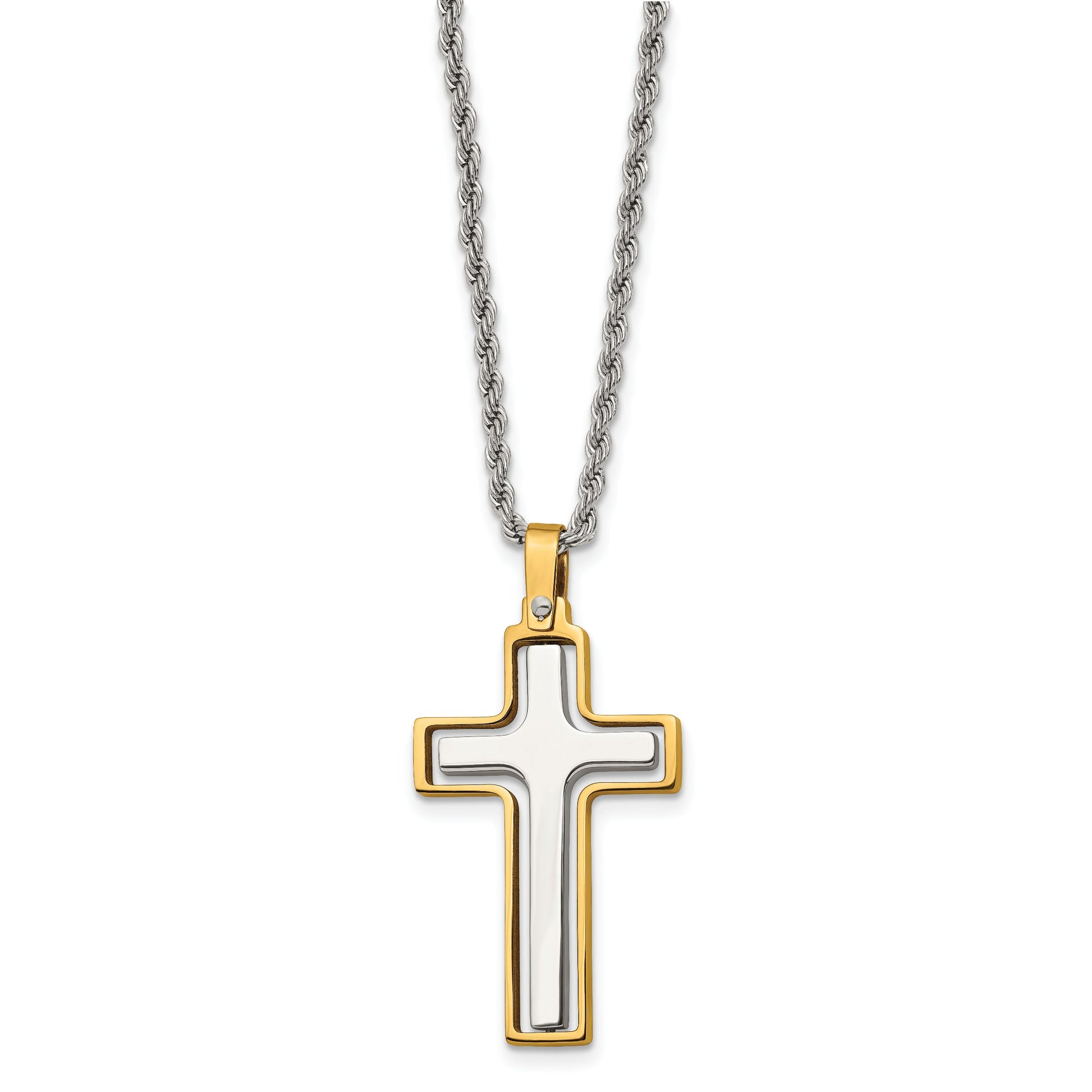 The Stainless Steel Chisel Polished Cross Necklace blends modern design with timeless elegance. Crafted in resilient stainless steel and enhanced with a gleaming gold-tone IP plating, this piece stands out with its distinctive laser-cut center cross. The pendant, designed for style and movement, hangs gracefully from a 22-inch rope chain. The lobster clasp ensures it stays secure around your neck, while the entire piece comes neatly housed in a gift box. Whether you're dressing up for a special night out or adding a subtle edge to your daily look, this unique cross necklace promises a chic, versatile accessory.