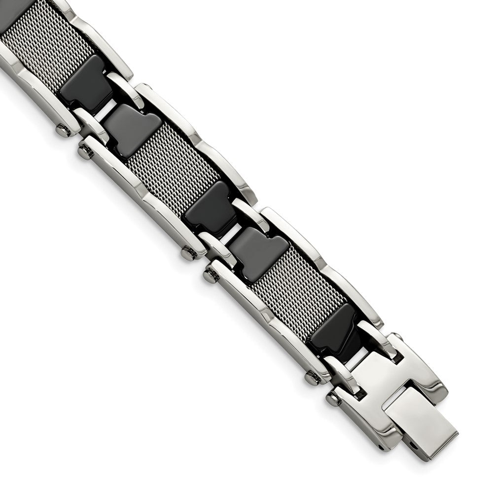 The Stainless Steel Chisel Polished Mesh With Black Ceramic 8.25 Inch Link Bracelet is a standout piece for the modern man. Crafted with a sleek stainless steel finish, it’s both stylish and durable. The black ceramic accents add a touch of sophistication, making it perfect for any occasion, from casual hangouts to formal events. Its 8.25-inch length ensures a comfortable fit for most wrists, and the fold-over clasp offers secure and easy wear. This bracelet comes gift-boxed, ready to impress. Elevate your accessory game with the Stainless Steel Chisel Polished Mesh With Black Ceramic Link Bracelet.