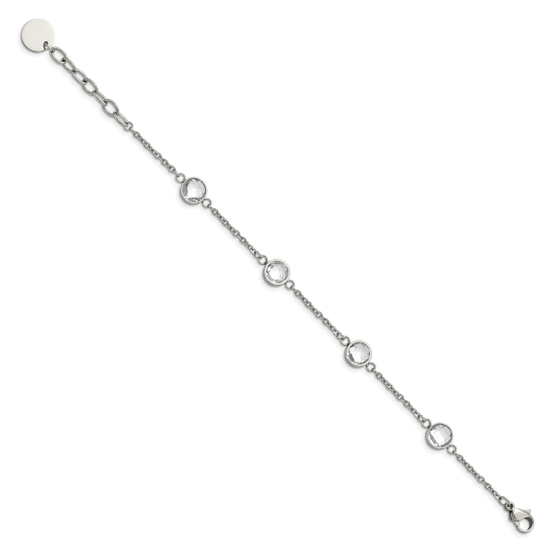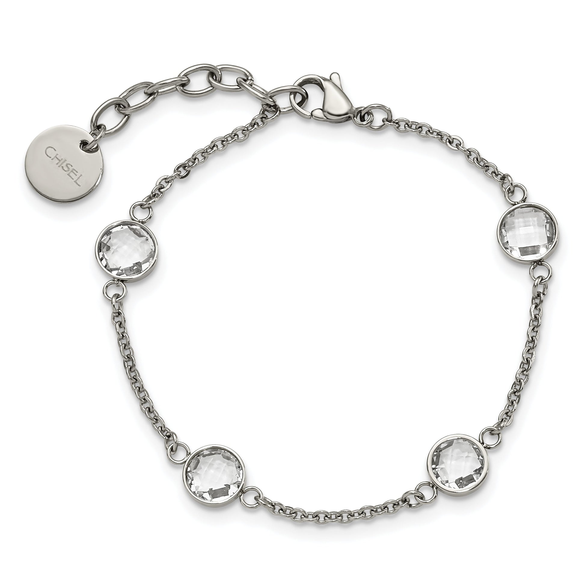 The Stainless Steel Chisel Polished Bracelet exudes timeless charm with its sleek 6.5-inch cable chain design. Its polished finish gives a lustrous glow while the clear glass stone adds just the right touch of elegance. The bracelet's chain measures a fine 1 mm in width, highlighting the sophisticated 8 mm charm. Effortless to wear, a fancy lobster clasp ensures a secure fit, with a 1.25-inch extender offering extra flexibility. Gift packaged for special occasions, this women's bracelet embodies understated luxury, making the Stainless Steel Chisel Polished Bracelet a perfect addition to any accessory collection.