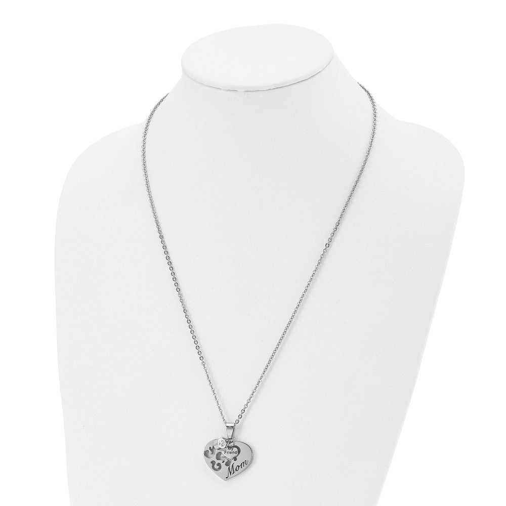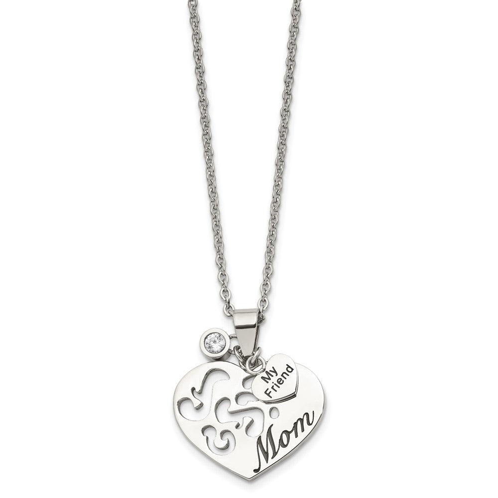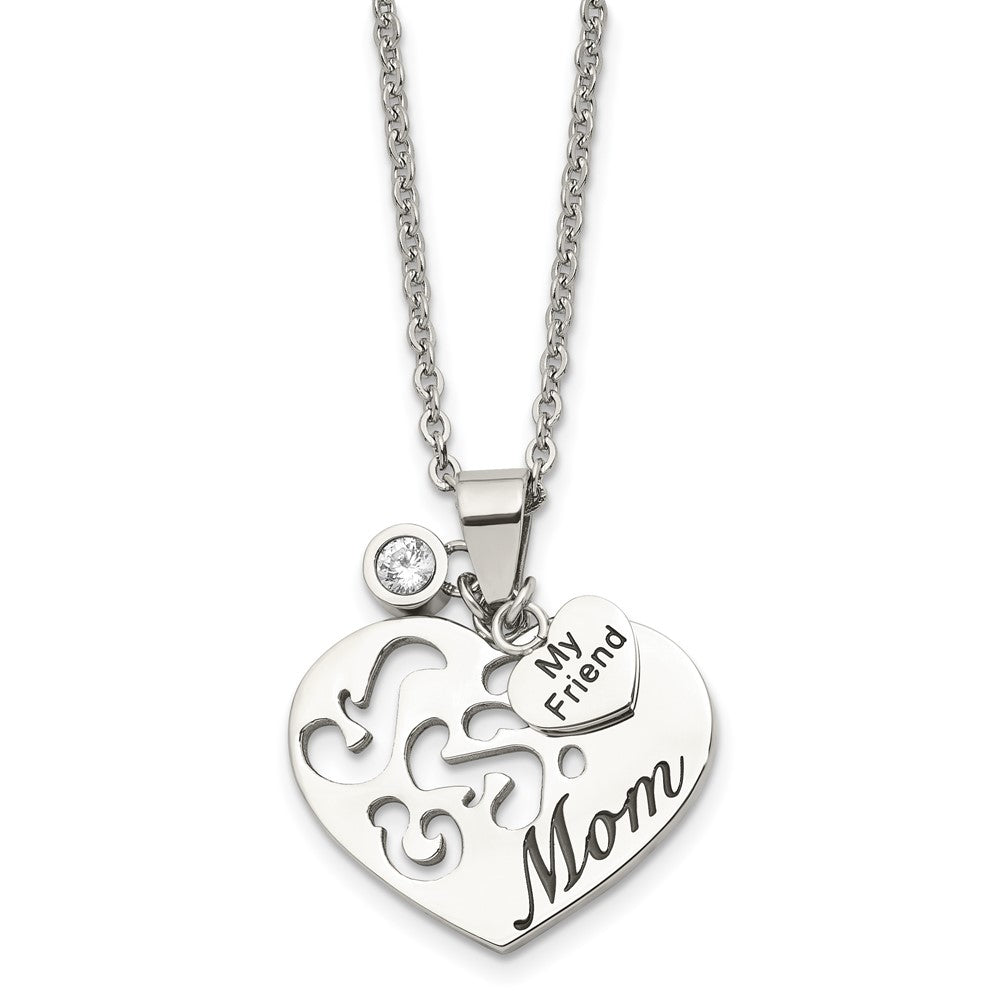 The Stainless Steel Mom My Friend Necklace combines heartfelt sentiment with timeless elegance. This 24-inch cable chain necklace boasts a polished and antiqued finish, offering a striking balance. The star is the pendant—a "Mom My Friend" message adorned with a sparkling cubic zirconia heart. The stone adds a touch of bling that catches the eye. Crafted from sturdy stainless steel, it exudes durability without compromising on style. The enameled details enhance its charm, making it a cherished keepsake. Packaged in a gift box, the Stainless Steel Mom My Friend Necklace is an ideal present for a special mom.