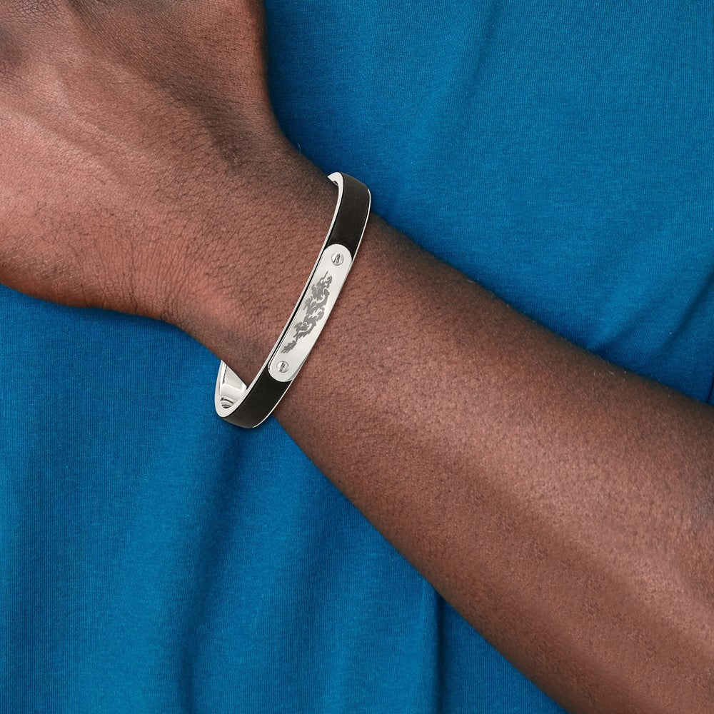 The Stainless Steel Polished Bangle with Black Rubber and Laser Etched Dragon design is a striking accessory for any style. Crafted from durable stainless steel, the bangle features a sleek brushed finish that catches the eye. The bold black rubber accents highlight the intricate dragon laser etching, combining strength with elegance. With an 8mm width and slip-on style, this bangle offers both comfort and a secure fit. Ideal for anyone, its unisex design makes it a versatile piece for any wardrobe. Elevate your look with this Stainless Steel Polished Bangle.