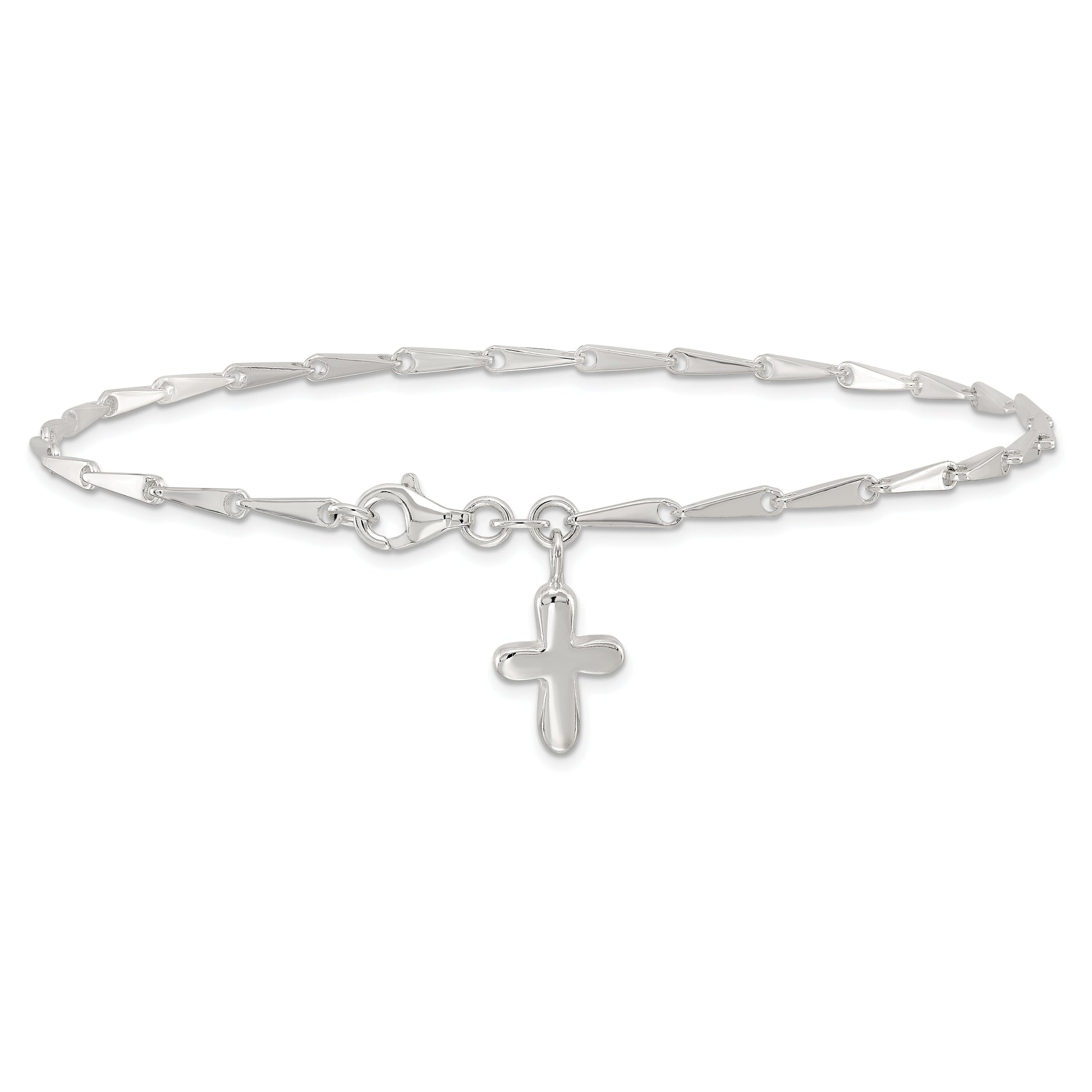 The Sterling Silver 10 In Solid Polished Cross On Fancy Link Anklet elegantly adorns any ankle. Crafted from high-quality 925 sterling silver, this anklet features a polished finish that captures light with brilliance. Its 10-inch length comfortably wraps around your ankle, while the fancy link chain adds a touch of sophistication. The cross charm, measuring 14 mm by 9 mm, symbolizes timeless elegance and style. Finished with an anti-tarnish coating and a secure lobster clasp, this anklet promises durability. Elevate your jewelry collection with this exquisite Sterling Silver 10 In Solid Polished Cross On Fancy Link Anklet.