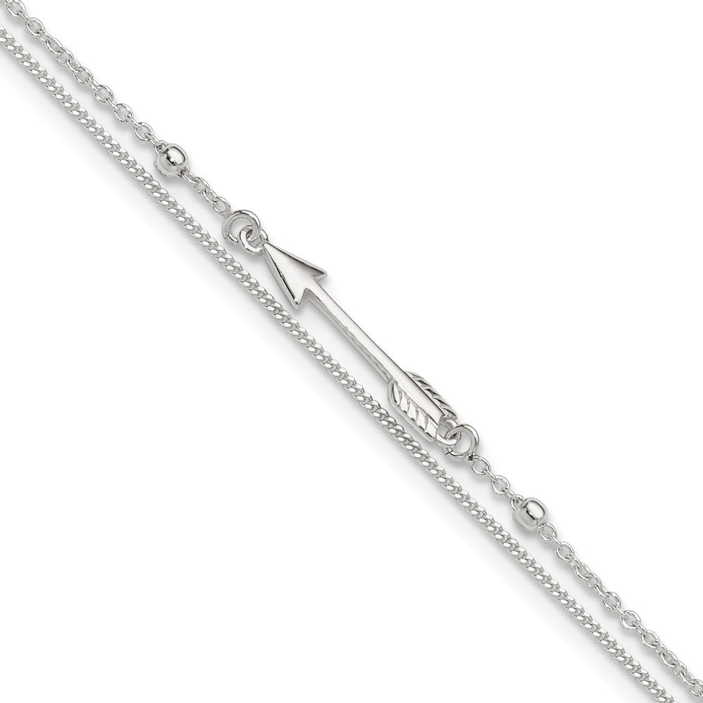 The Sterling Silver 9In Plus 1In Ext. 2-Strand Arrow and Bar Anklet charms any ankle with a sleek, polished finish. Crafted from 925 sterling silver, this anklet resists tarnish, ensuring long-lasting shine. Measuring 10 inches, including a 1-inch extender, it suits any wrist with an adjustable fit. Its double-strand design and arrow and bar elements, measuring 23.4 mm by 4.5 mm, add elegance and style. With a secure spring ring clasp, it stays in place through your day. This anklet embodies refined beauty and versatile wear. The Sterling Silver Arrow and Bar Anklet elevates any outfit with grace.