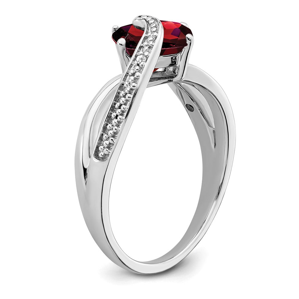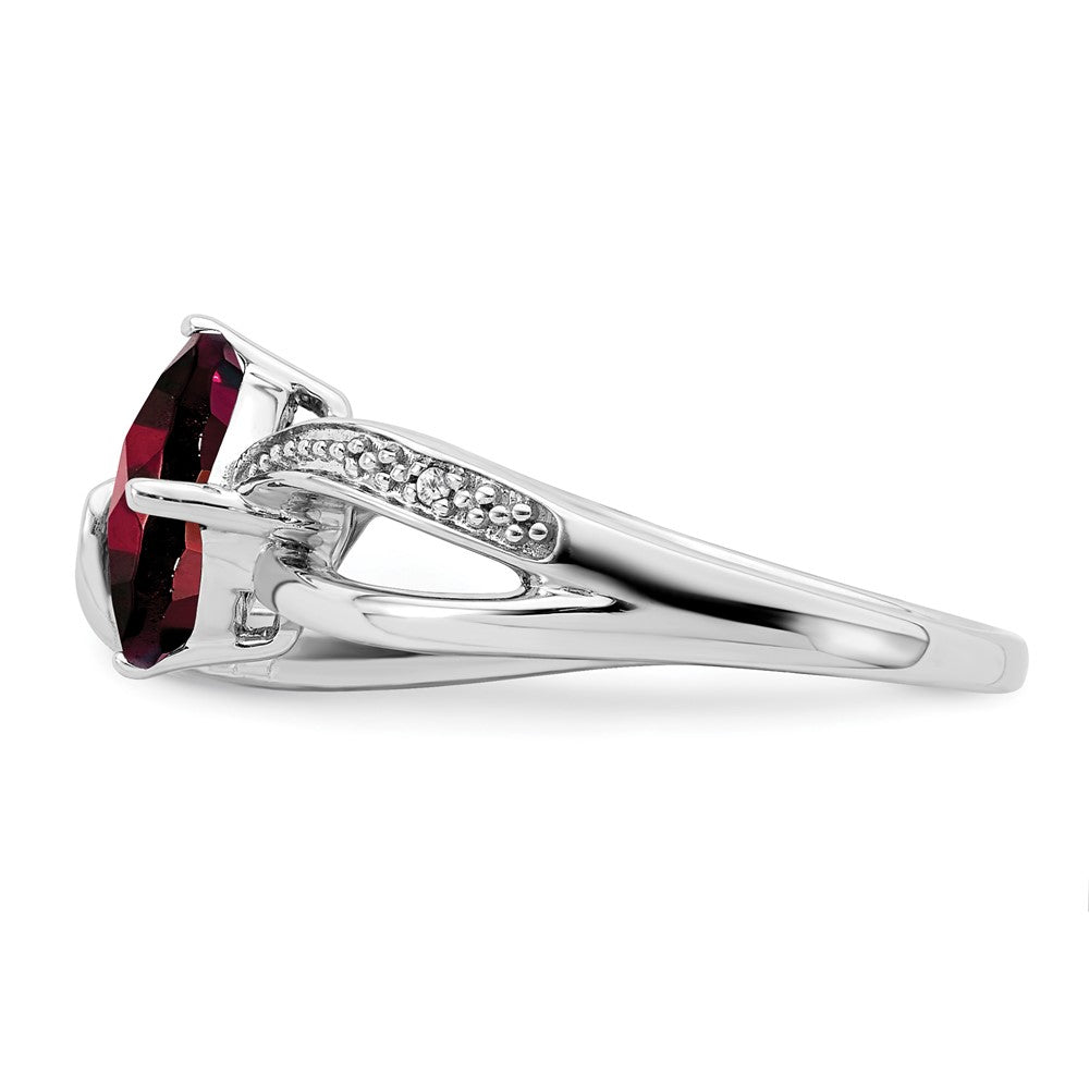 This is a ring made of sterling silver that has a beautiful purple amethyst stone and two small diamonds. The band of the ring is tapered, meaning it is thinner in some places than others. The amethyst stone is cushion-shaped and 7mm in size, while the diamonds are round and very small. The ring is polished and has a rhodium plating to help prevent tarnishing. This is a women's ring and cannot be resized. The top of the ring is 10mm in both length and width. The amethyst is a natural stone that has been heated to enhance its color, and the diamonds are also natural.