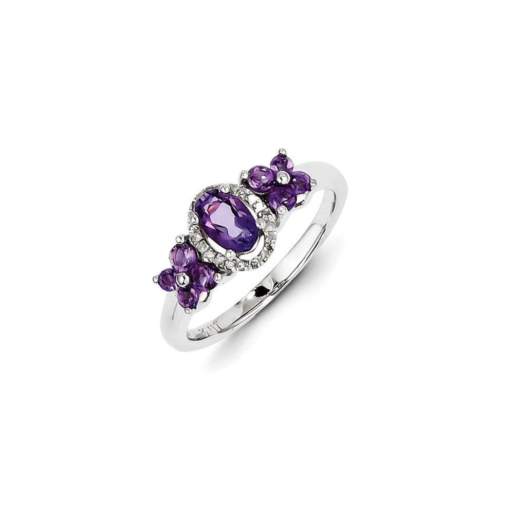Introducing our exquisite 'Sterling Silver Amethyst Diamond Ring'. Made with high-quality 925 sterling silver, this piece features four stunning amethyst stones and 22 natural diamonds. The amethyst stones are oval and round in shape and come in a beautiful purple hue. The diamonds are set in pavé, while the amethyst stones are prong set. The total weight of the amethyst stones is 0.42 carats, while the total weight of the diamonds is 0.431 carats. To enhance the color and clarity of the stones, they have been heat-treated. Measuring 2mm in width, this ring is a statement piece that offers both elegance and sophistication. Perfect for any occasion, this gemstone ring is sure to turn heads.