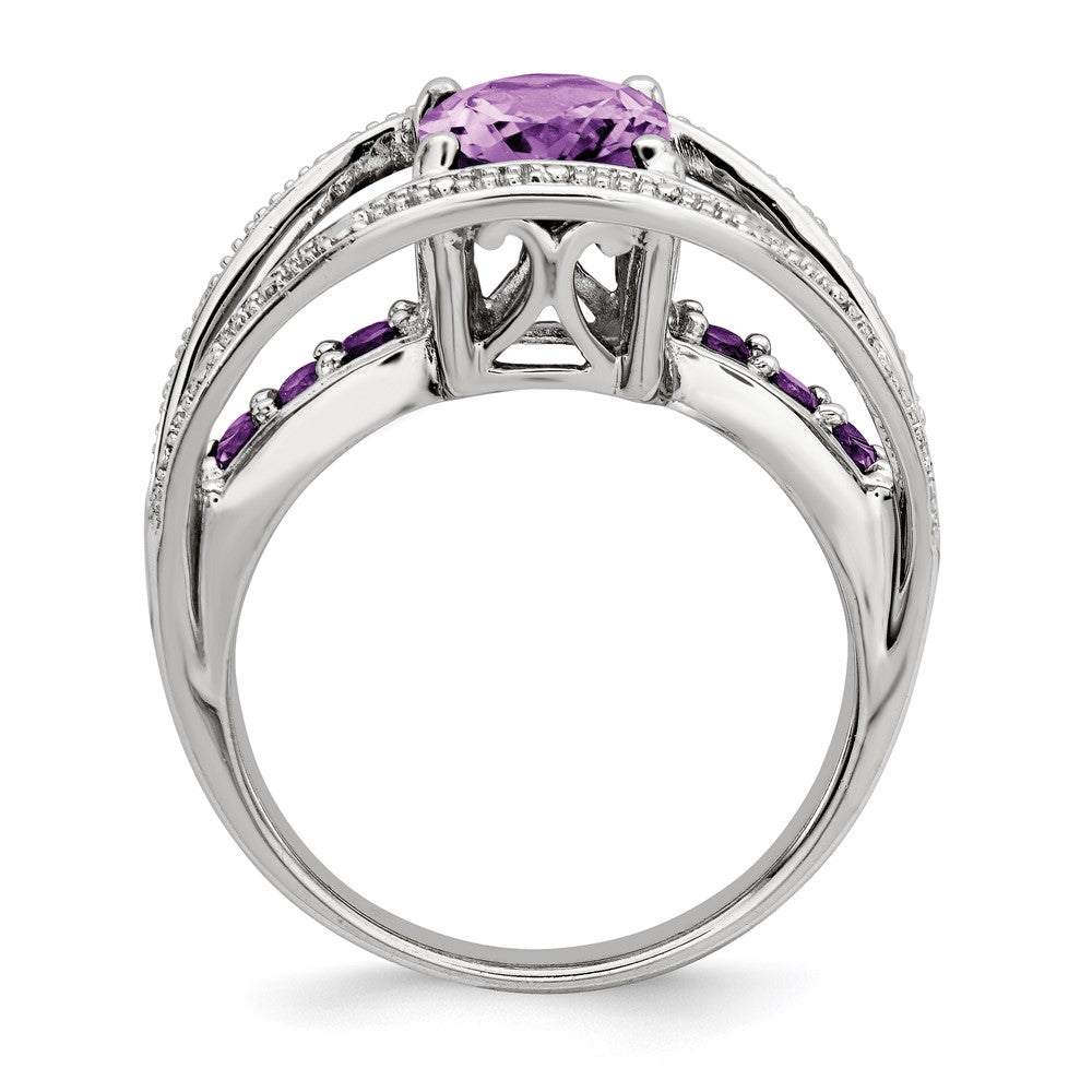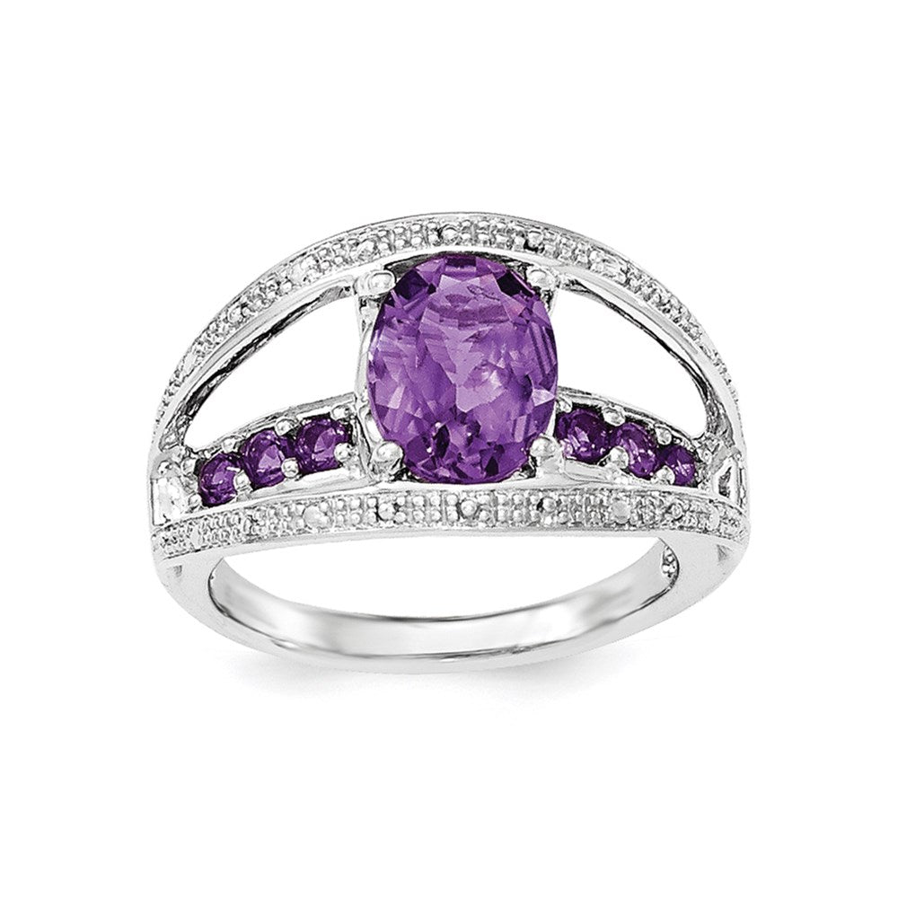 'Indulge in the luxurious beauty of our Sterling Silver Amethyst Ring. Meticulously crafted from 925 sterling silver, it features one oval-shaped, natural amethyst with a weight of 1.44 carats, as well as six round, natural amethyst stones with a combined weight of 0.030 carats. The stones are beautifully set in prongs to ensure their safety and durability. This ring also boasts a stunning white color, perfect for pairing with any outfit. With its gemstone creation method of natural heating, it exudes a rare and eye-catching allure. Ideal for any occasion, this ring is the perfect complement to any jewelry collection.'