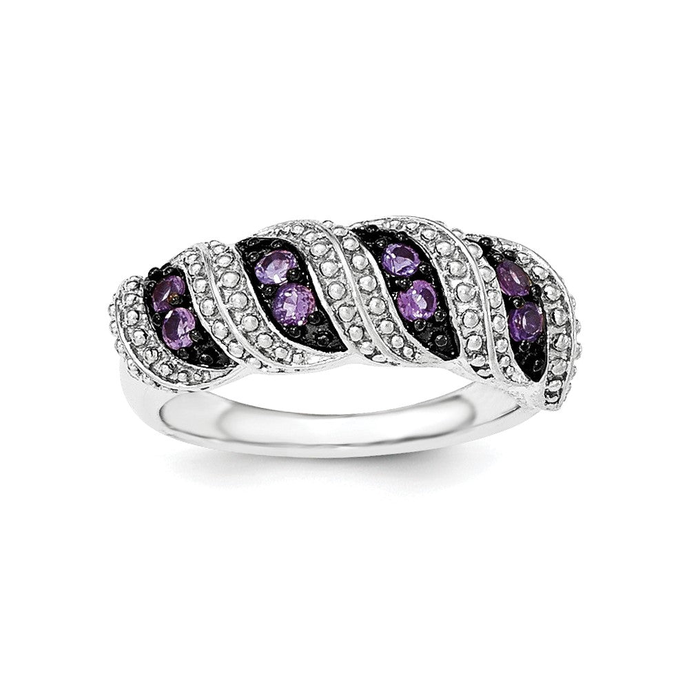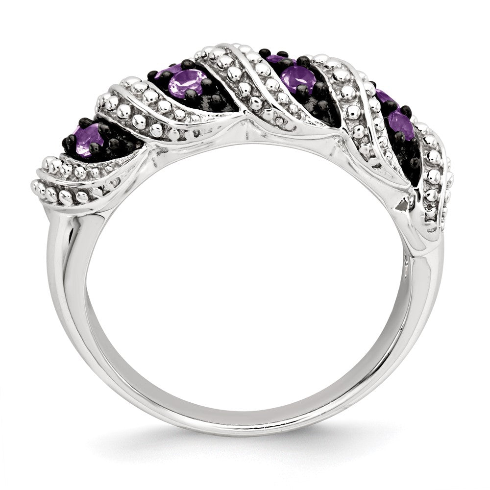 This exquisite piece of jewelry is a Sterling Silver Amethyst Ring, crafted with the finest materials to ensure durability and longevity. Made with high-grade 925 silver, this ring features eight stunning amethyst stones in a beautiful purple shade, each individually held in place by a prong setting. The combined stone weight is 0.035 ct and the stones are of round shape and 2 mm in size. The amethyst stones are natural and have undergone a heating treatment to enhance their natural color. This ring is perfect for any occasion and adds a touch of elegance to any outfit.