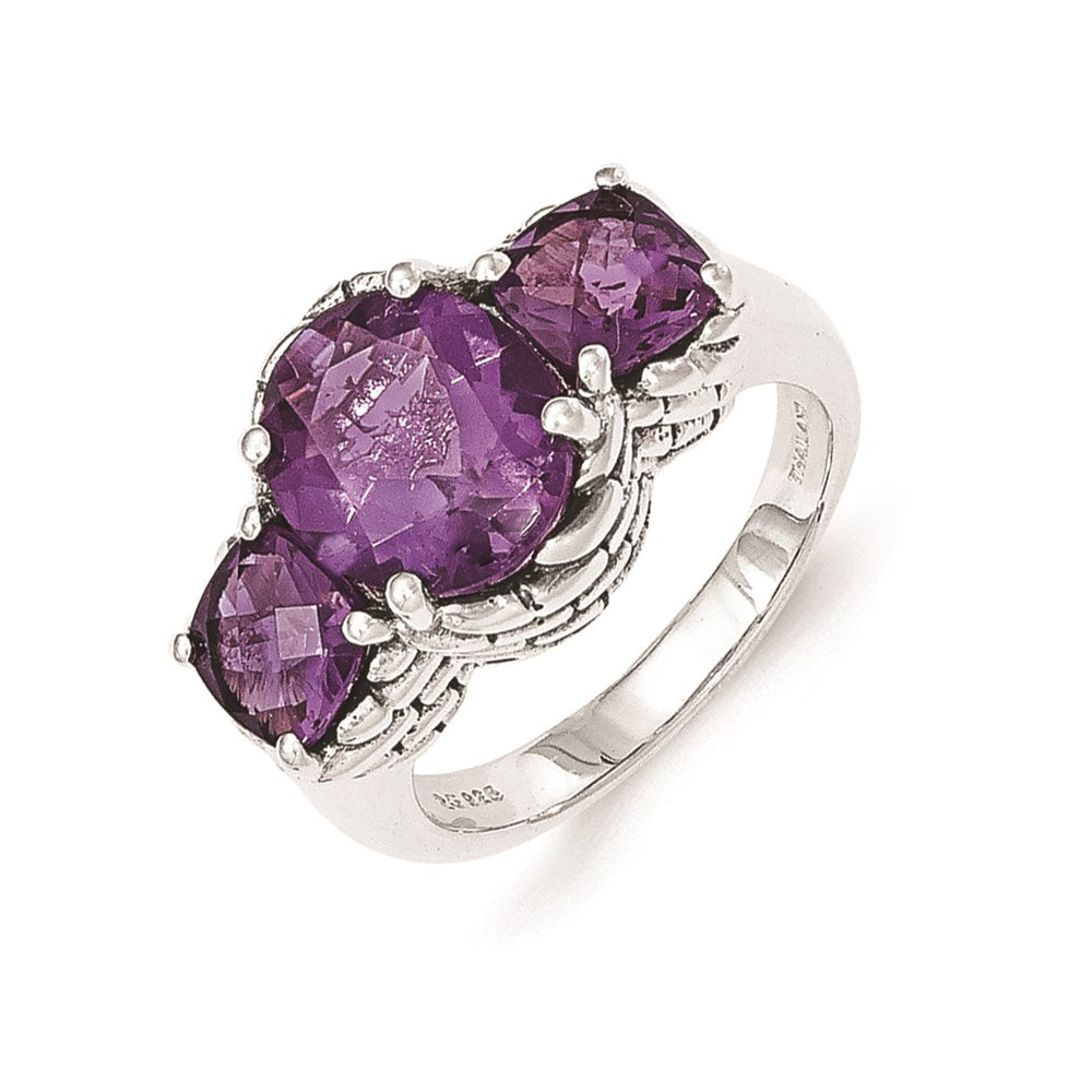 Introducing the Sterling Silver Amethyst Ring. Made of high-quality 925 sterling silver, this beautiful ring showcases a stunning oval-shaped amethyst stone that weighs 2.88 carats. Two additional cushion-cut amethyst stones, weighing 0.900 carats, are prong-set on both sides of the center stone, making for a perfect and balanced composition. The purple stones are heated to create their natural checkerboard texture, making each ring unique. This gemstone ring is perfect for any occasion and makes a great addition to any jewelry collection. Order now and add this gorgeous Sterling Silver Amethyst Ring to your wardrobe today!