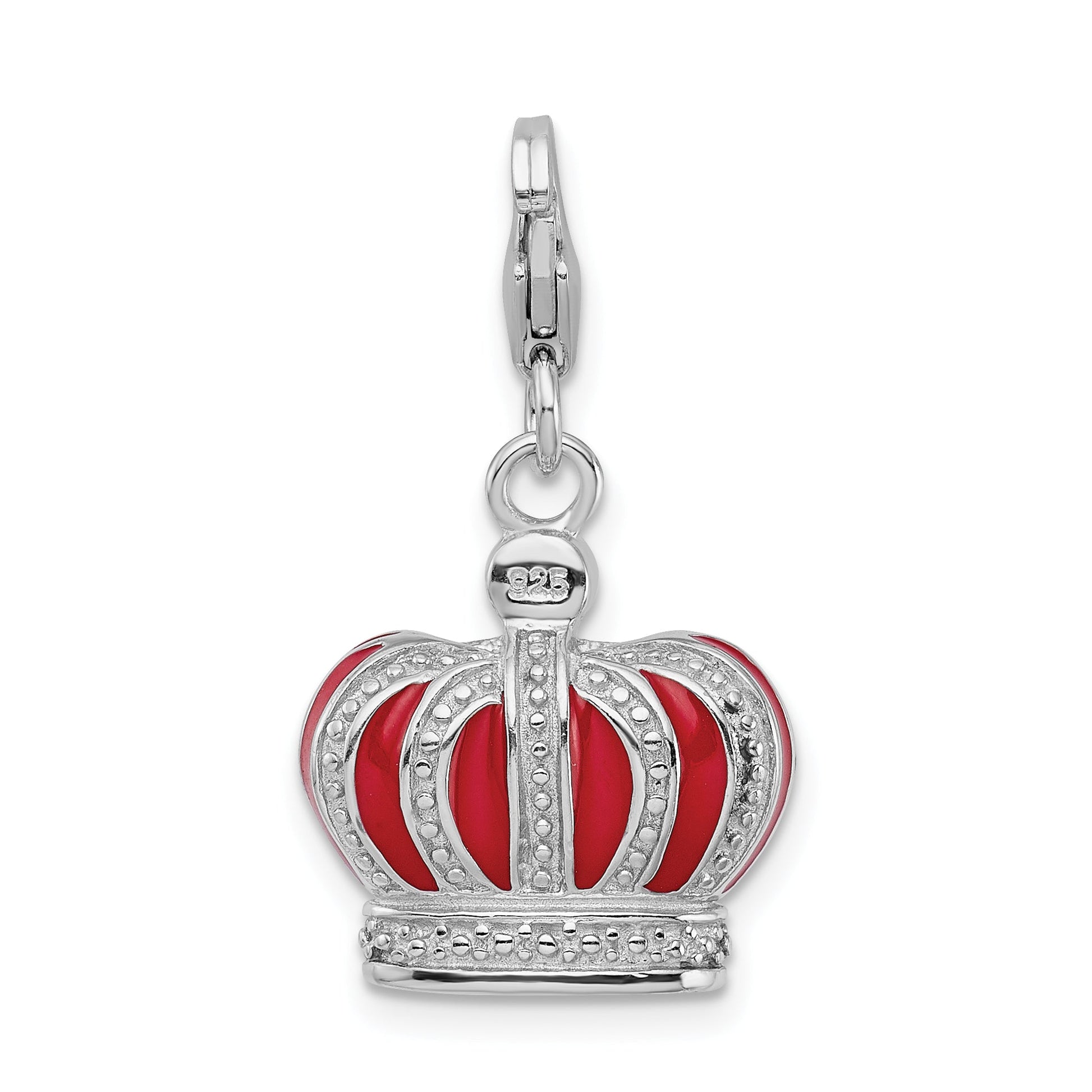 The Sterling Silver Amore La Vita Rhodium-Plated 3-D Crystal from Swarovski and Red Enameled Crown Charm truly captivates with its exquisite design. This charm boasts a gleaming 925 sterling silver finish, highlighting its crafted red enamel crown. The embedded Swarovski crystal shines with a white hue, adding a touch of elegance. Its lobster clasp ensures secure attachment, making it a perfect addition to your charm collection. Measuring 35 mm in length, this charm showcases intricate detailing, ideal for any themed jewelry piece. Elevate your style with the Sterling Silver Amore La Vita Crown Charm.
