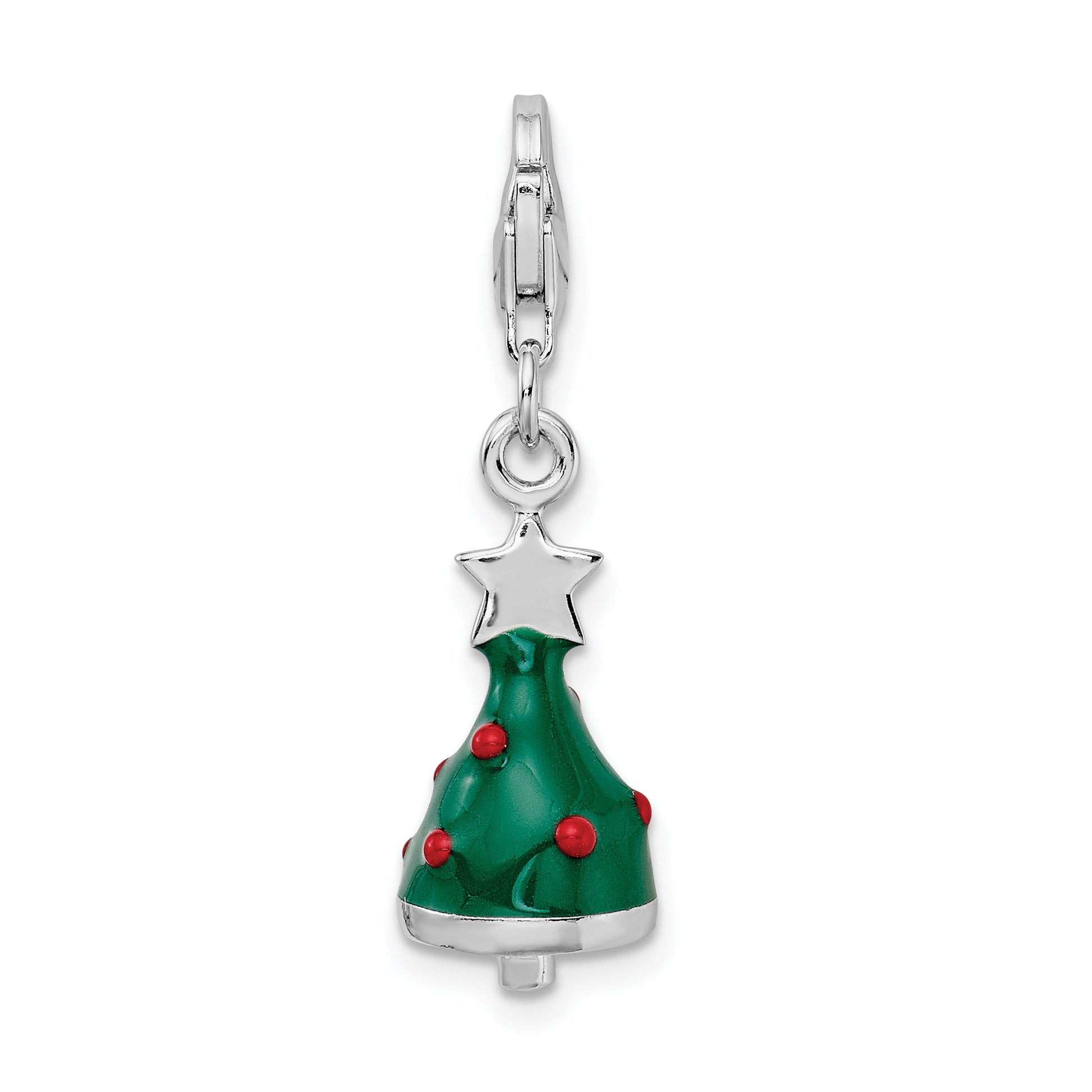 The Sterling Silver Amore La Vita Rhodium-Plated 3-D Enameled Christmas Tree Charm stands as a dazzling piece in the world of fine jewelry. Crafted from pure 925 sterling silver, it boasts intricate enamel accents in vibrant red and green. Measuring 29mm in length and 9mm in width, this charm features a polished finish enhanced by rhodium plating. Its 3D design beautifully captures the holiday spirit, while the fancy lobster clasp ensures secure and easy attachment. Add a festive touch to any accessory with this elegant piece. Embrace the holidays with the Amore La Vita charm's classic allure.