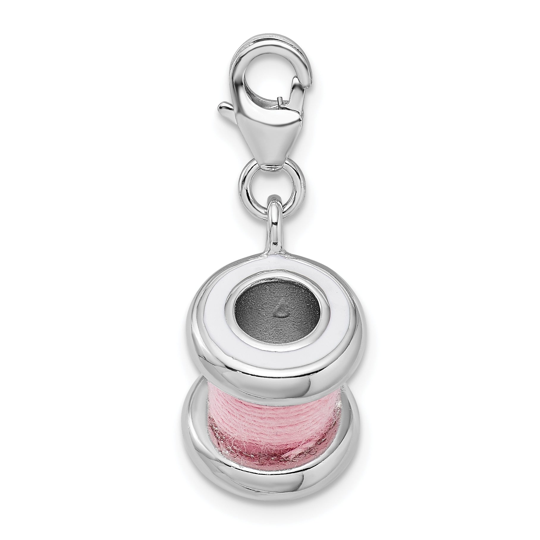 Add a touch of whimsy to your collection with the Sterling Silver Amore La Vita Rhodium-Plated Polished 3-D Enameled Pink Spool Of Thread Charm. This unique charm features a detailed design in solid sterling silver, offering vibrant pink enamel accents for added flair. Its rhodium plating provides a lasting shine and protection against tarnish. Measuring 34 mm in length, this charm is easy to attach with its fancy lobster clasp for secure wear. Perfect for any sewing enthusiast or craft lover, explore the playful appeal of this delightful addition. Enhance your jewelry with the Amore La Vita Charm's gorgeous style.