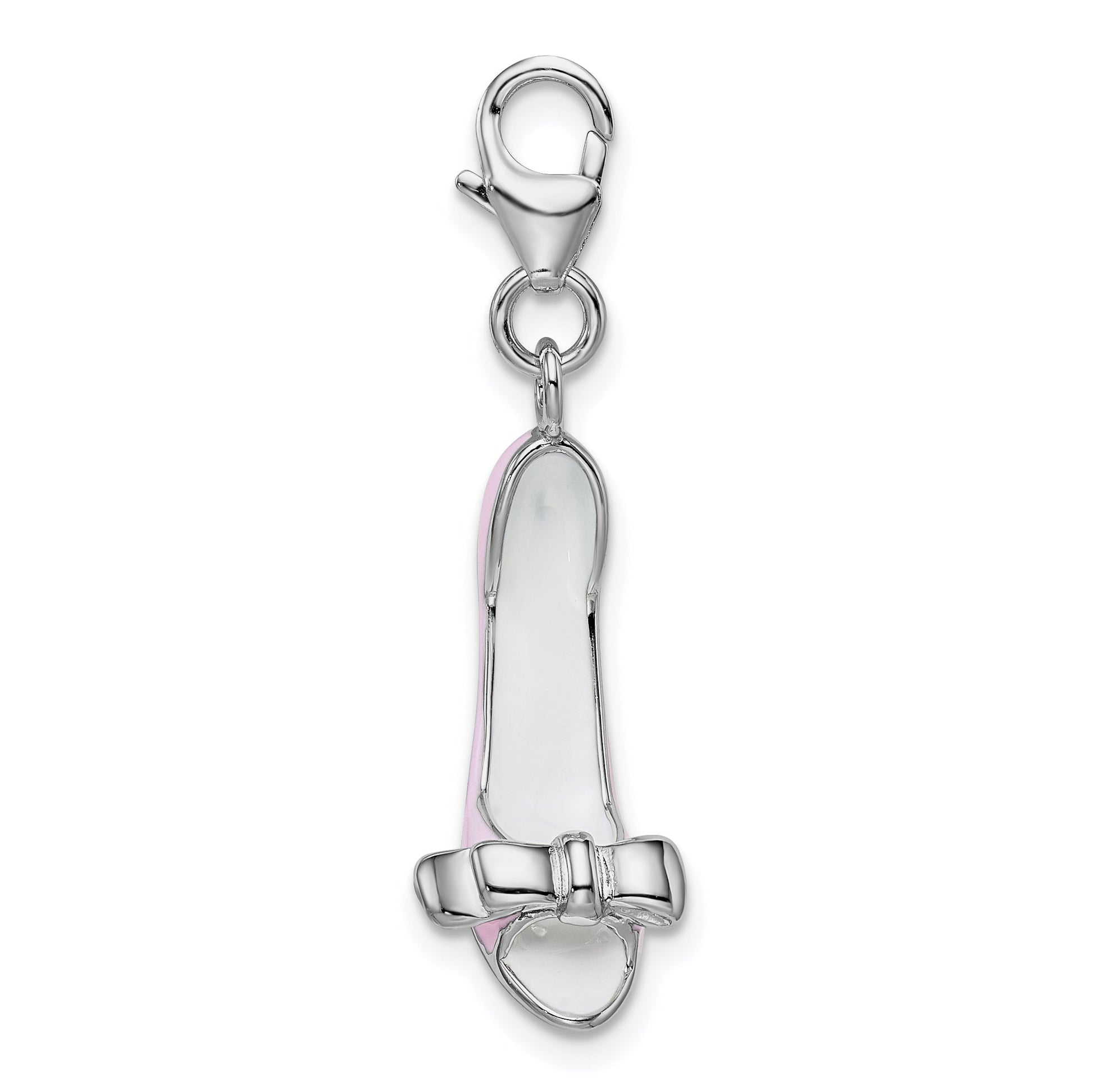 The Sterling Silver Amore La Vita rhodium-plated 3-D pink enameled bow-top high heel charm is a stunning piece for those who love a dash of whimsy in their jewelry. This polished treasure, crafted from 925 sterling silver and adorned with pink enamel, is sure to make a statement. Its 3D design gives it depth, and the rhodium plating adds a rich, lasting shine. Measuring 39 mm in length, this charming pendant features a secure, stylish lobster clasp. With its intricate design and premium materials, the Amore La Vita charm is perfect for adding a playful elegance to any collection.