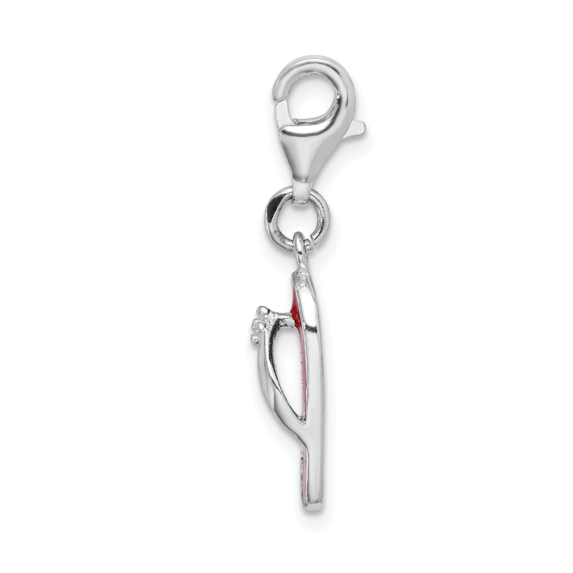 The Sterling Silver Amore La Vita Rhodium-Plated 3-D Red Enameled Sandal Charm is a stunning piece that adds a playful touch to any jewelry collection. Made from 925 sterling silver, the charm features a vibrant red enameled sandal design that pops with color. The rhodium plating gives it a brilliant shine, while the 3D detail adds depth and intrigue. This whimsical charm measures 35 mm in length and 7 mm in width, making it a perfect size for pendants or bracelets. Secured with a fancy lobster clasp for easy attachment, this charm delivers both style and convenience. Add the Sterling Silver Amore La Vita Sandal Charm to your collection for a unique themed accessory.