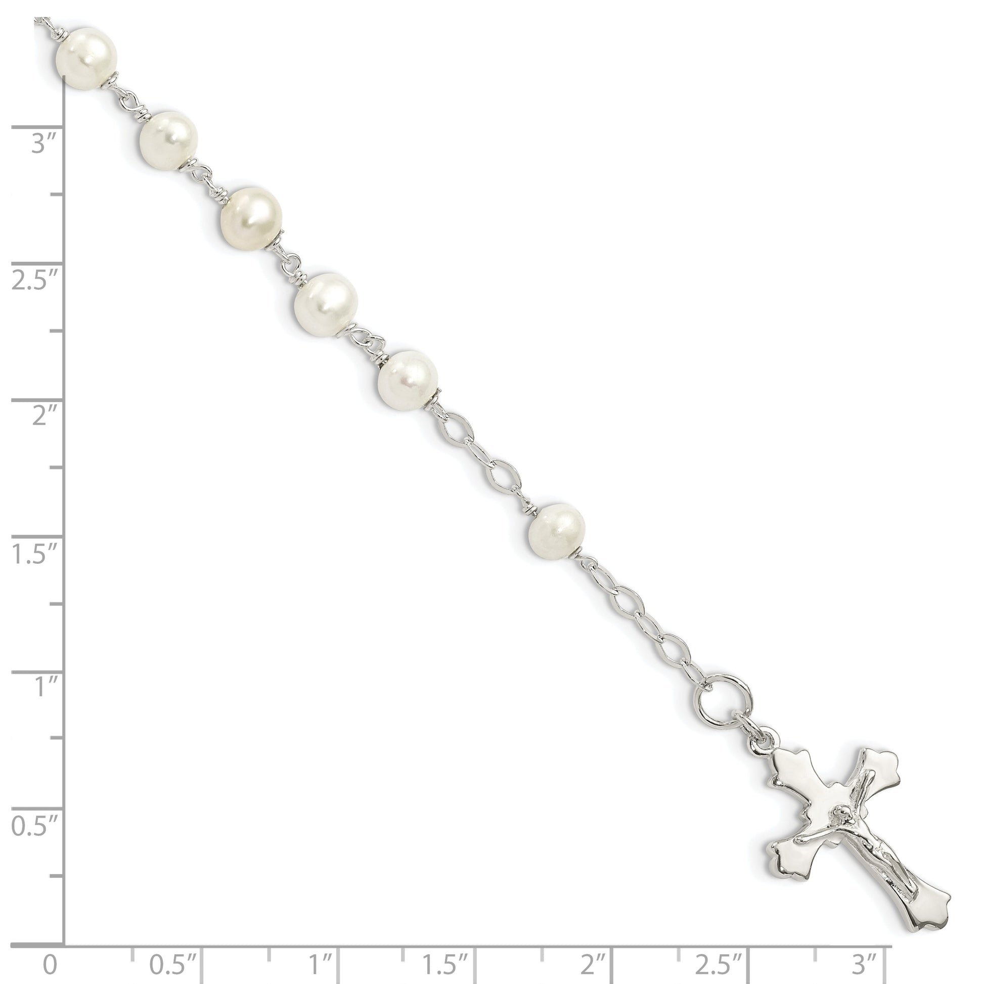 Our elegant Sterling Silver and Freshwater Cultured Pearl Rosary Bracelet measures 7.5 inches, offering a touch of grace with every wear. Made from 925 pure sterling silver, the bracelet boasts a polished finish, ensuring a lustrous sheen that catches the light beautifully. Each pearl is a cultured freshwater creation, displaying a classic white hue that complements the silver's shine. The bracelet's solid build is accented with a detailed charm, adding sophistication to this timeless piece. A spring ring clasp promises secure wear, making this Sterling Silver and Freshwater Cultured Pearl Rosary Bracelet a perfect choice for any occasion.